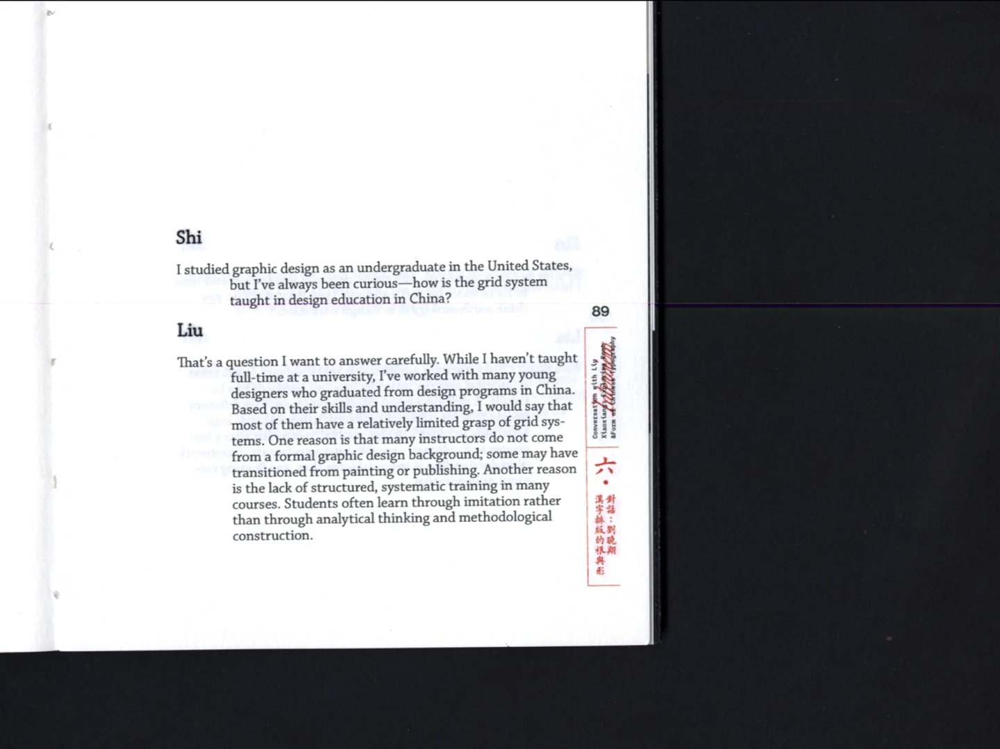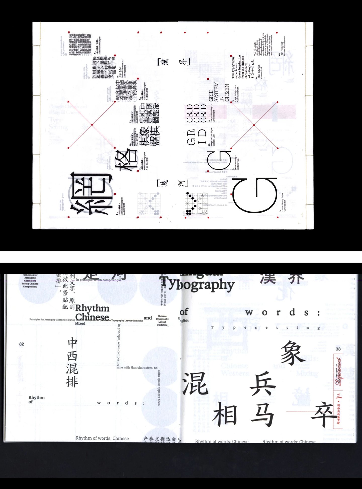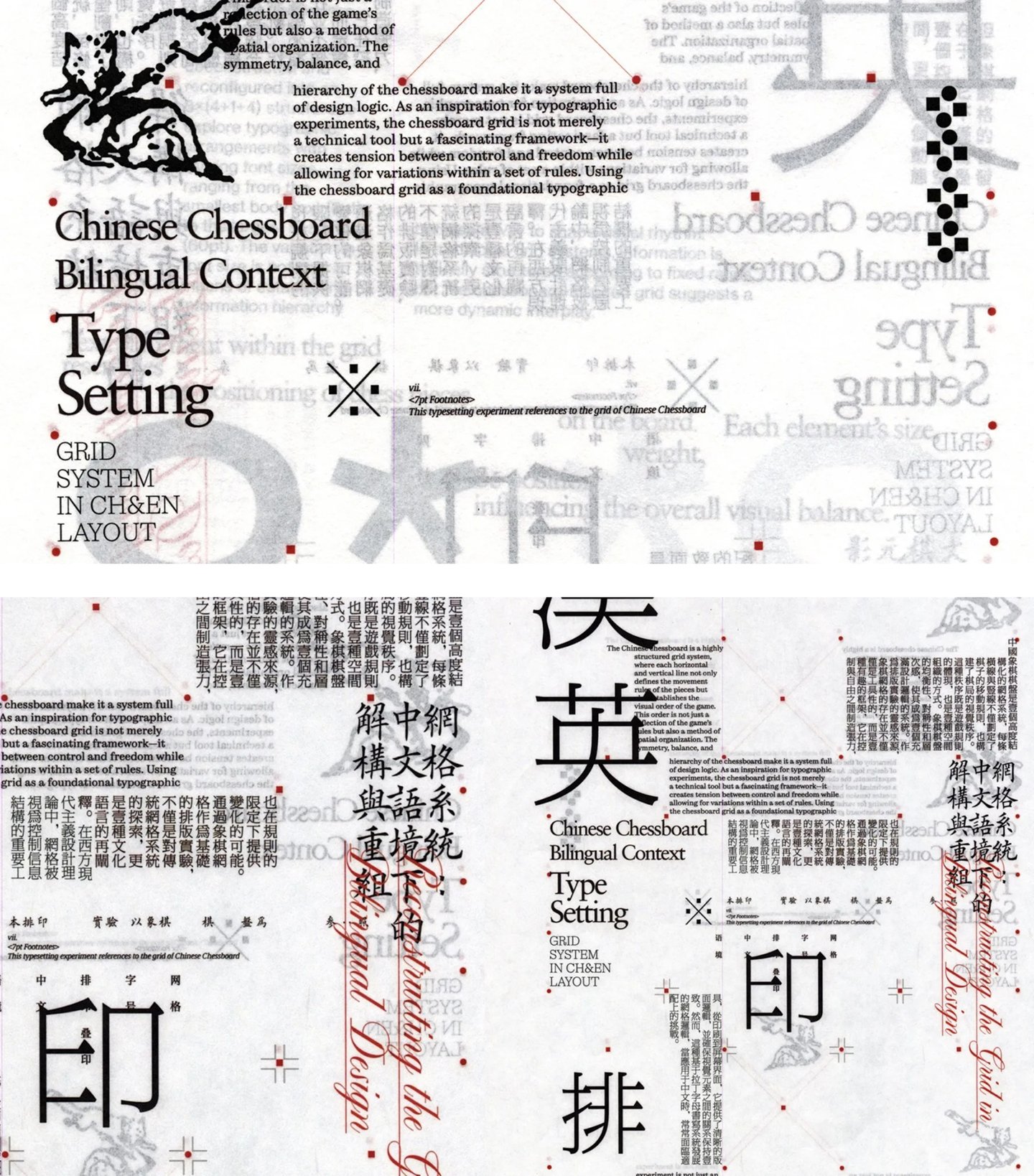 В работе «Реконструкция сетки: китайская типографика в контексте двуязычного дизайна» Цзятин Ши размышляет над сеткой в контексте китайской типографики и латинской, ее возможностями, расположением текста и знаков внутри нее. Как взаимодействуют эти сетки, Цзятин Ши размышляет про их структуру, правила, отличия и различия.