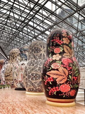Самой масштабной во всех смыслах этого слова определенно можно считать выставку гигантских матрёшек в Афимоле, Москва. Данная практика представляет собой смелую кураторскую стратегию, трансформирующую традиционный образ в монументальное художественное высказывние.