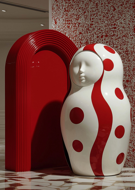 Данная инсталляция представляет собой интерактивный объект, где зрители могут физически взаимодействовать с формой, ощущая себя одной из частей матрешки, помещаясь внутрь фигуры.