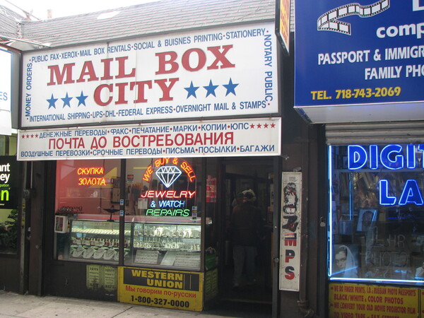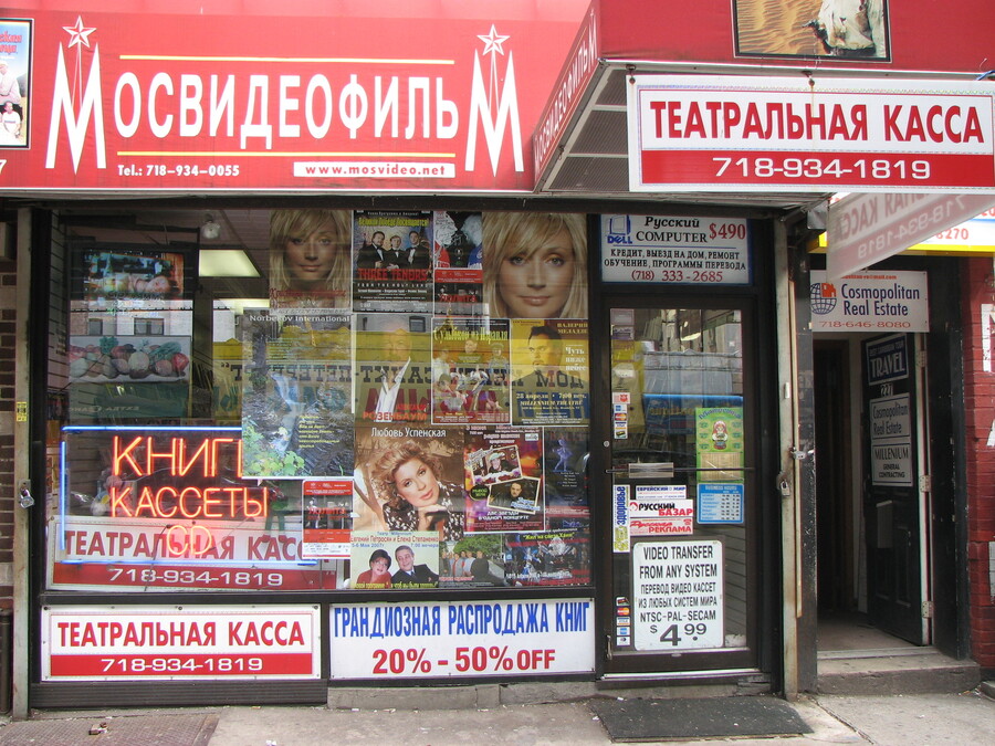 На Брайтон-Бич до сих пор сохраняется архаичный слой — старые пластиковые вывески, лого времён 90-х, типографика «Продукты» или Mosvideofilm, анонсы мероприятий с советскими артистами. Эти элементы почти не обновляются, и именно они создают ощущение «советского прошлого», застывшего во времени.
