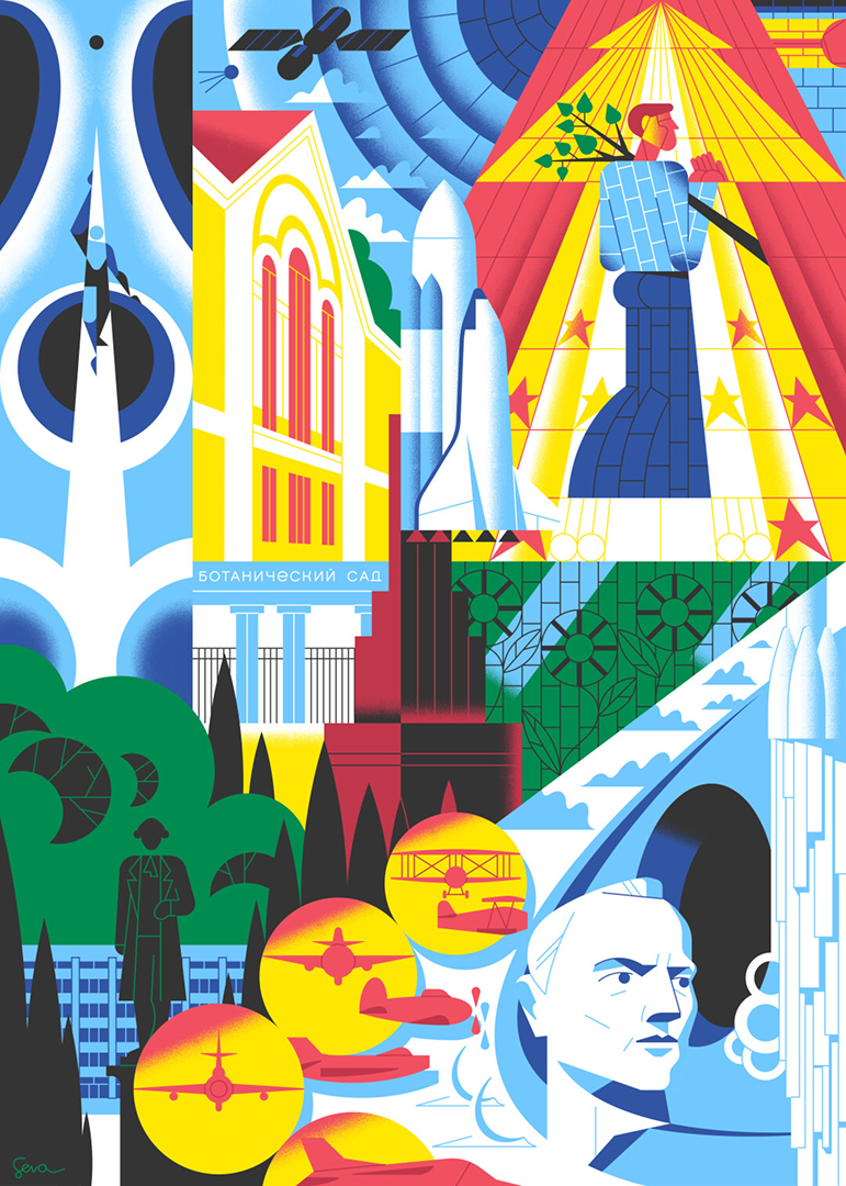 Безусловно, архитектура также задействуется авторами при создании работ. Помимо городских зарисовок, архитектурные объекты в современных работах могут выступать в роли букв, переосмысляться через технику коллажа или плаката. Такой подход позволяет сочетать уникальное восприятие художника с обращением внимания на тот или иной фрагмент города.