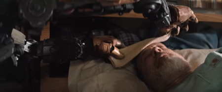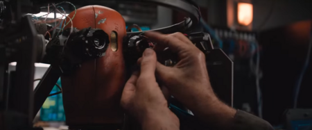 При этом сам творец до последнего не мог принять заботу робота. Отстраненность Финча подчеркивается в композиции нескольких сцен, когда героев разделяет вертикальная преграда или расстояние.