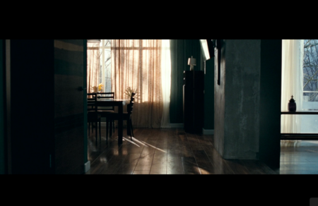 Композиции внутри квартиры строится на строгой симметрии и пустоте как между предметами интерьера, так и между людьми. За столом Елена и Владимир сидят далеко друг от друга. Крупные планы появляются крайне редко, камера будто намеренно избегает касания тел, оставляя героев в пределах общих или средних планов. В сцене у зеркала Елена появляется раздвоенной: её собственный образ как бы отстраняется, становится отдельной сущностью. Этот приём подчёркивает ключевую черту её существования — она живёт рядом со своей жизнью, но не внутри неё.