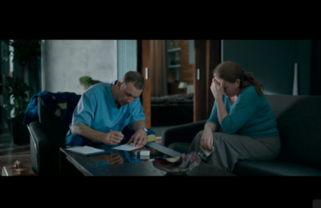 Лицо героя-медика на этих кадрах всегда находится в состоянии истощения, отчаяния. Ощущение «провала» внимания делает его присутствие как будто неполным: физически он рядом, но эмоционально где-то не здесь. Этот визуальный жест не дает зрителю отпустить образ человека, работающего до исчезновения самого себя и теряющего способность быть в отношениях.