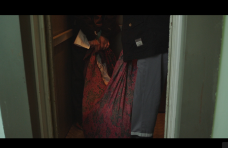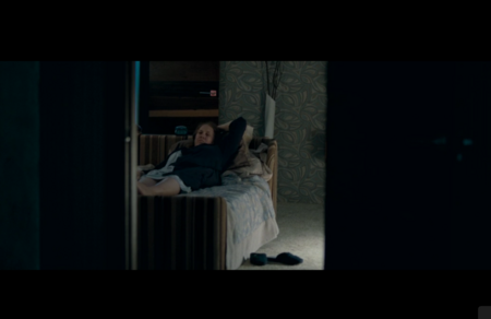 Появление ребёнка в той же спальне вводит важный контраст. Голубой комбинезон выделяет младенца на сером фоне, делая его единственным «живым» элементом в мире, пропитанном контролем и страхом. Он занимает пространство, где разворачивается ключевая моральная драма.