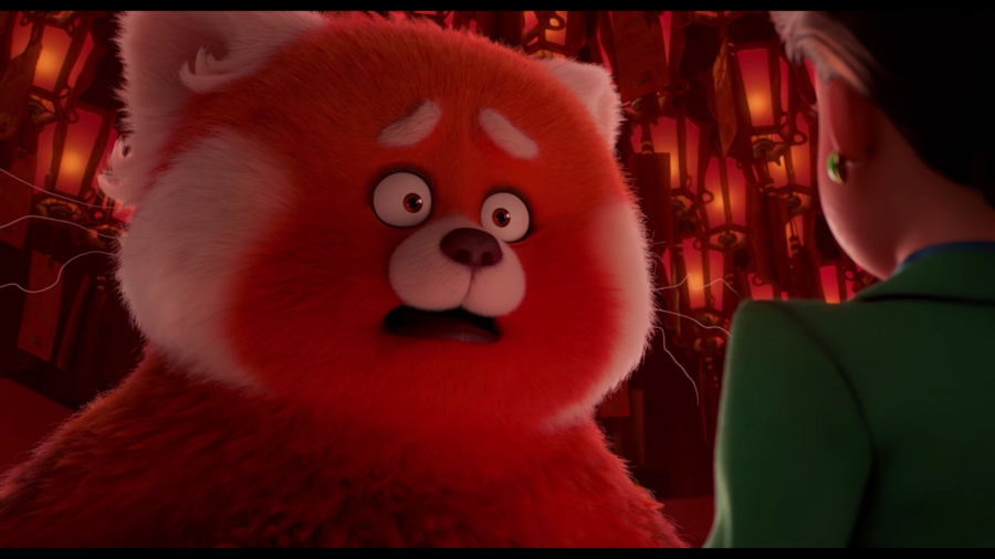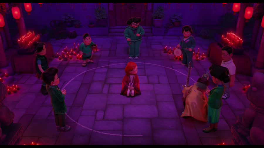 Личное пространство Мэй-мей всегда окрашено в красный, а зоны опсности, отчужденности, а также зоны влияния ее матери и бабушки в зеленый. Такое визуальное противостояние символизирует поколенческий конфликт являющийся ключевой темой картины