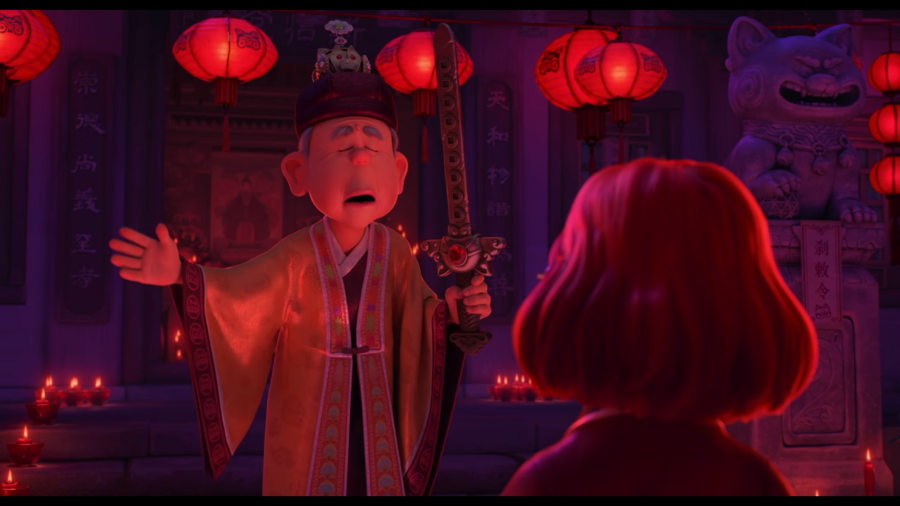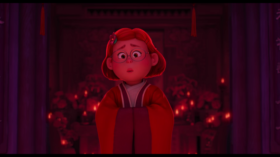 Но красный, традиционно считающийся цветом опасности в этой картине несет в себе еще одну важную функцию. это цвет предков главной героини, их наследия. Китайские фонарики, свечи на алтаре — все это светит красным, но не угрожает. Это связано с азиатской традицией, где красный несет в себе удачу и благополучие.