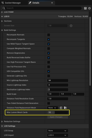 • Использует Surface Cache — систему автоматической параметризации поверхностей близлежащей геометрии для быстрого поиска освещения в точках попадания лучей. • Фиксирует свойства материала для каждого меша под разными углами. Эти позиции («карты» или «Cards») генерируются в автономном режиме для каждого меша. По умолчанию создаётся 12 карт на меш; их количество можно увеличить через настройку Max Lumen Mesh Cards в Static Mesh Editor.