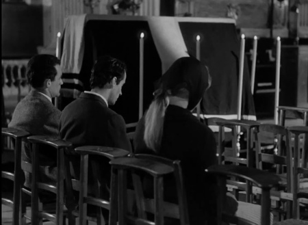 Тишина в церкви — это не духовное открытие, откровения не происходит. Пространство церкви говорит, но сознание героя-закрыто.