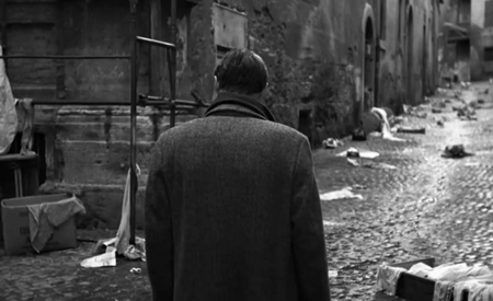 Отчуждение и одиночество показаны через фигуру Горчакова, который смотрит спиной к зрителю, что создает ощущение отстраненности и одиночества. Его внутренний голос, звучащий на фоне его неподвижной фигуры, символизирует постоянный внутренний диалог, который не приводит к примирению и спокойствию.