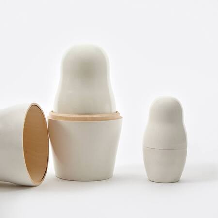 Рис. 2.14 Maison Margiela. «Белые Матрёшки». 2022. Дерево, шёлк, ручная роспись. Рис. 2.15 Maison Margiela. «Белые Матрёшки». 2022. Дерево, шёлк, ручная роспись.