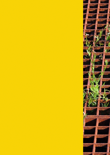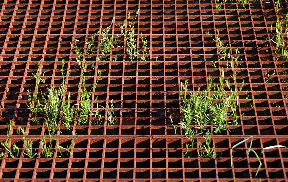 Второй дворик более сценографичен: деревянный помост, металлические решетки с пробивающимися растениями. Все растения здесь сорняковые, что буквально можно рассматривать как «сорняки общества» [1].