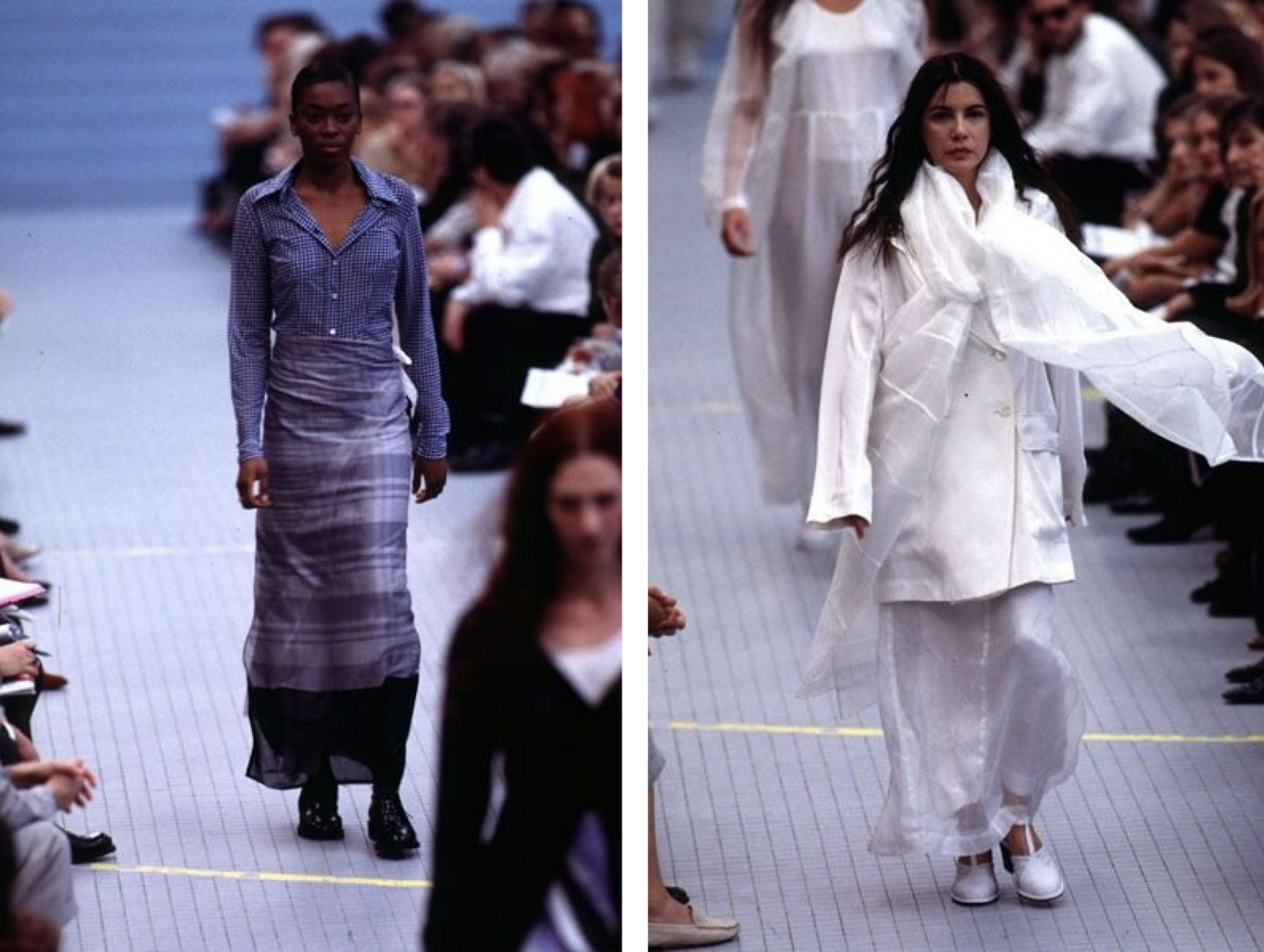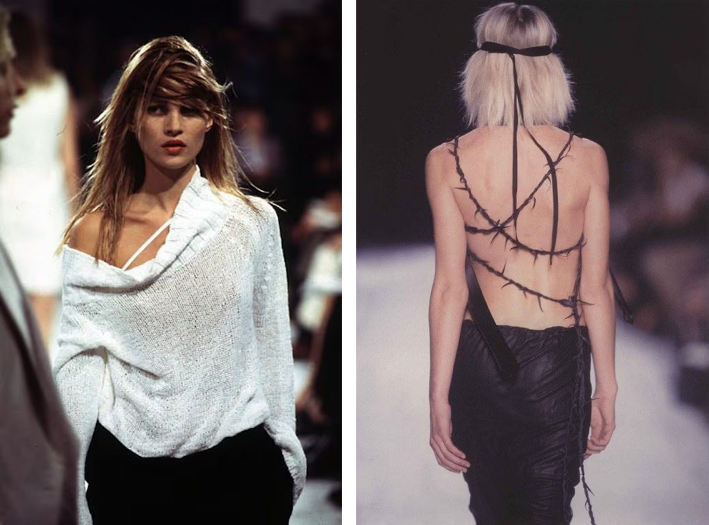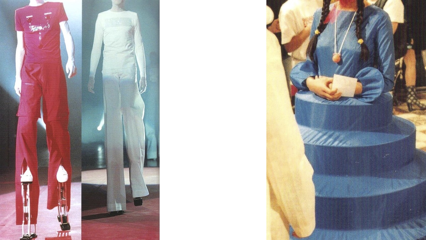 Экспериментальные силуэты строятся на принципах асимметрии, нарушенных равновесий, неожиданного распределения объемов. Форма может смещаться относительно тела, создавая новые пропорции и изменяя центр композиции. Для визуального ряда подойдут архивные кадры, в которых видно, как многослойность, драпировка, «ломаные» линии или избыточные объемы формируют новый образ фигуры, отличающийся от классических модных канонов.