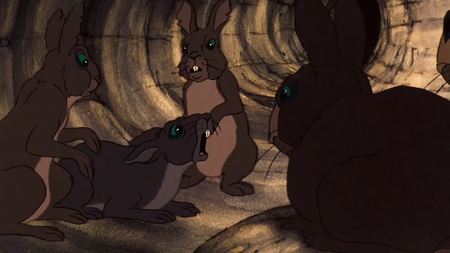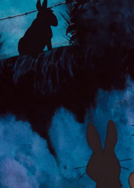 Непредусмотрительность лидера ведёт к трагичным последствиям: люди засыпают кроличьи норы и вся колония задыхается. Искажённые морды кроликов в жёлтом тумане, окровавленный ковш, вгрызающийся землю и поднимающий в воздух тушки зверьков — сцена навеяна ужасами войны, которые удалось пережить автору первоисточника.