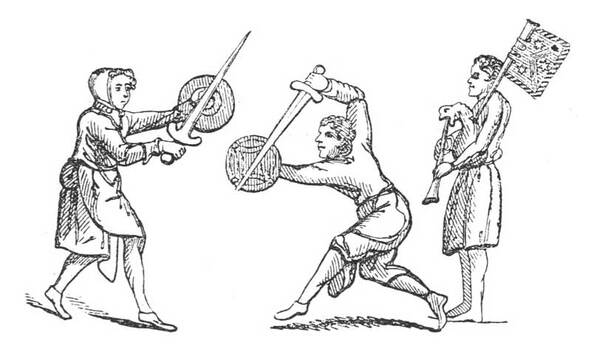 (рис. 10) Англосаксонский танец с мечами. Из рукописи «Клеопатра», VIII век, Британский музей. / (рис. 11) Танец с мечами под волынку, XIV век. Из 2 B vii., Королевский манускрипт, Британский музей.