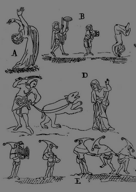 (рис. 12) танцоры XIV века. A и C — акробаты; B — акробаты и балансирующие под тамбур; D — женщина, танцующая вокруг избитого медведя; E — танцующие шуты.