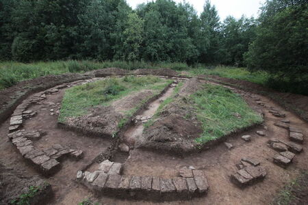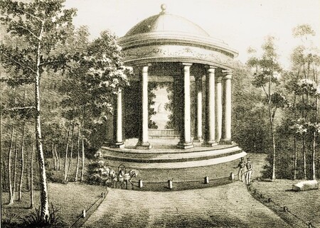 Храм Солнца. Литография фон Петерса по рисунку из альбома Богдановича «Двенадцать видов мызы Тайцы», 1840-е гг. / Обнаруженный археологами фундамент Храма Солнца (фото сайта Хранители Наследия)