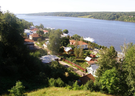 В работе «Над вечным покоем» Левитан изобразил холм с церковью у воды. На современной фотографии немного другой ракурс, но та же церковь. Так же на фотографии видно туристический объект с установленной скульптурой художника.
