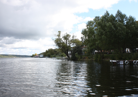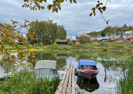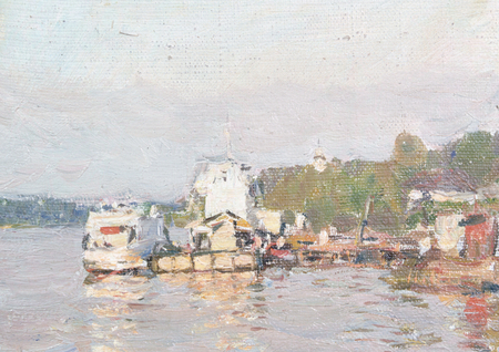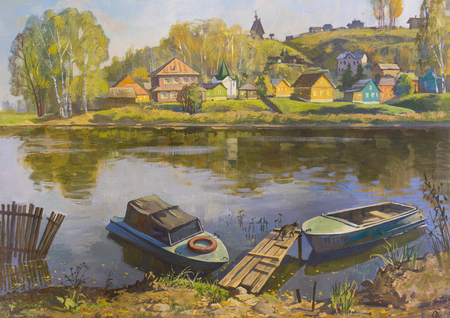 На картине изображён тихий участок реки с лодками у берега, отражения в воде, спокойная атмосфера. Современное фото показывает почти тот же вид: лодки на реке, прибрежные домики, мостки.
