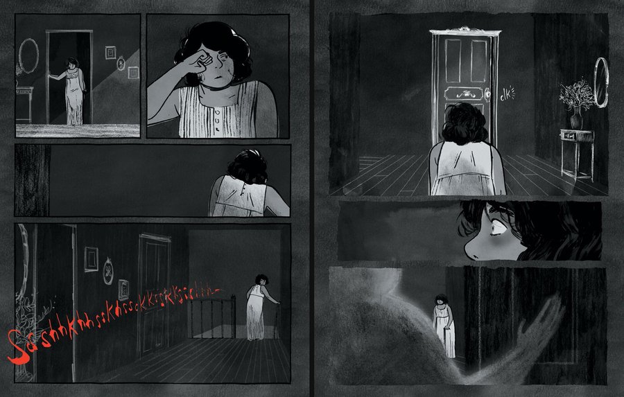 Интересная работа проделана с пространством. Некоторые страницы выполнены в формате привычных нам комиксов, с фреймами, в которых прослеживается обычное повествование. Другие полностью выходят за рамки этого: черно-белый поэтажный план дома, в котором была убита Энн, страница-инструкция со всеми нужными для призыва духа предметами, просто молчаливая иллюстрация во всю ширину, показывающая нам вечеринку.