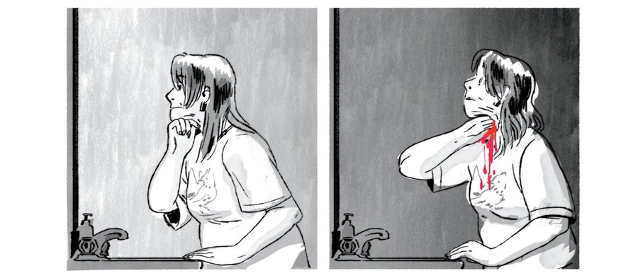 Так как текст является частью общего, его отсутствие становится сразу заметным. Комиксистка использует развороты, в которых резко пропадают какие-либо слова и звуки, все просто замирает. И мы тоже. «Тихие» фреймы оставляют нас наедине с чувством накапливающейся бушующей тревоги, ни на секунду не покидающего беспокойства. Нас отправляют на рандеву с мучительной тишиной и бурлящим потоком мыслей.