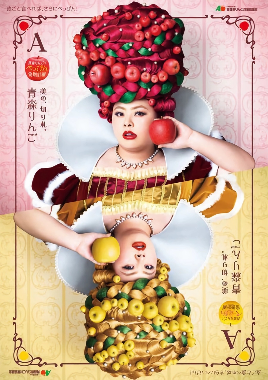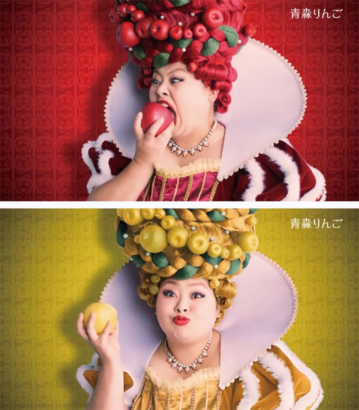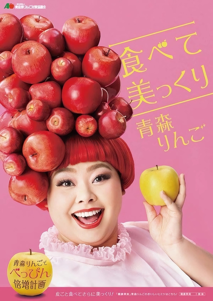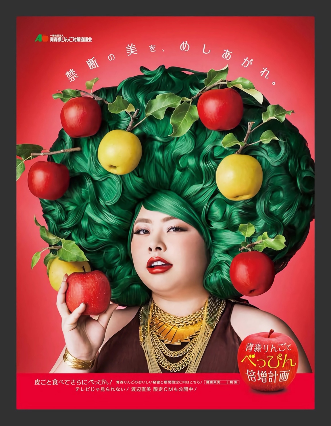 Азиатская реклама славится своей необычной и сумасшедшей подачей и образами, которые крайне непривычны для европейского и западного глаза. Однако подобная реклама с участием «японской Бейонсе» выглядит очень даже гармонично и ее смелый характер хорошо вписывается в необычные образы. Одним из таковых предстает в рекламе яблок (рекламирование которых само по себе непривычно) Аомори. В общем и целом, как у самих образов Наоми, так и у дизайнеров рекламы часто делается акцент на волосах (что можно проследить в некоторых вышеприведенных примерах), однако здесь он выражен наибольшим образом, что является фишкой рекламы (весь акцент совмещен на них и портретную часть). С одной стороны, такие вещи, как волосы и еда, не очень хорошо сочетаются и даже могут вызвать омерзение у зрителя, но здесь они гармонично вплетены в прическу, отсылающую к странной моде на парики прошлых веков, куда что только не вплеталось.