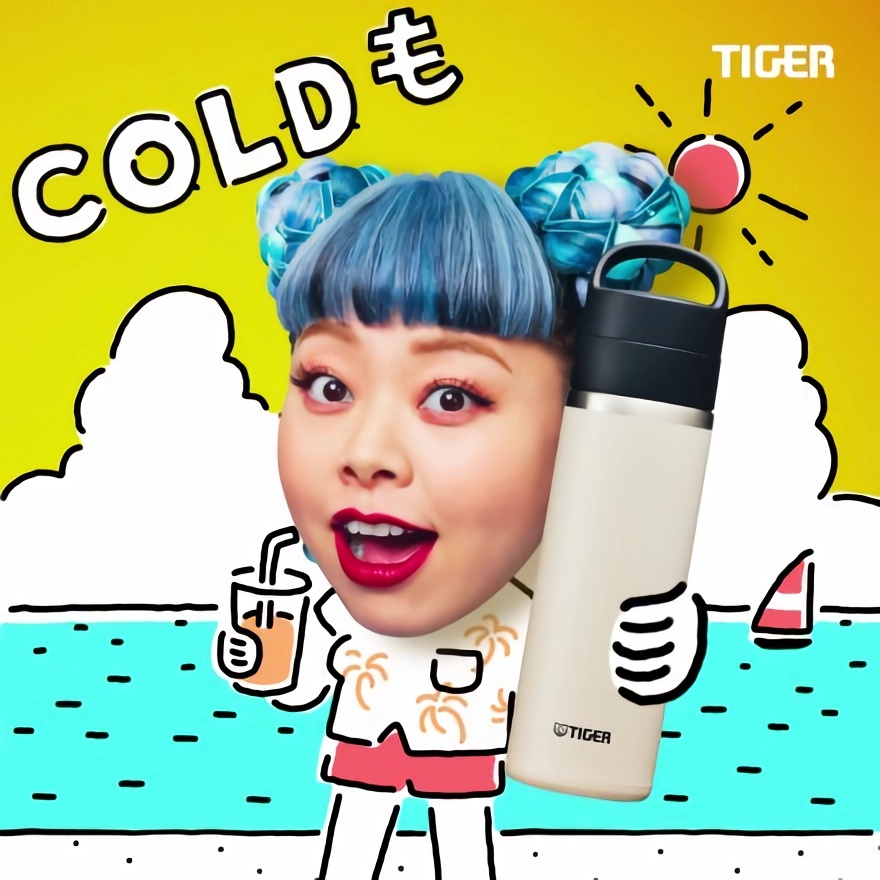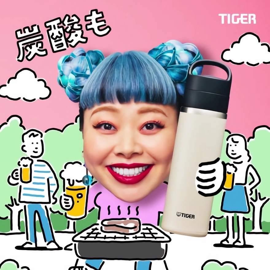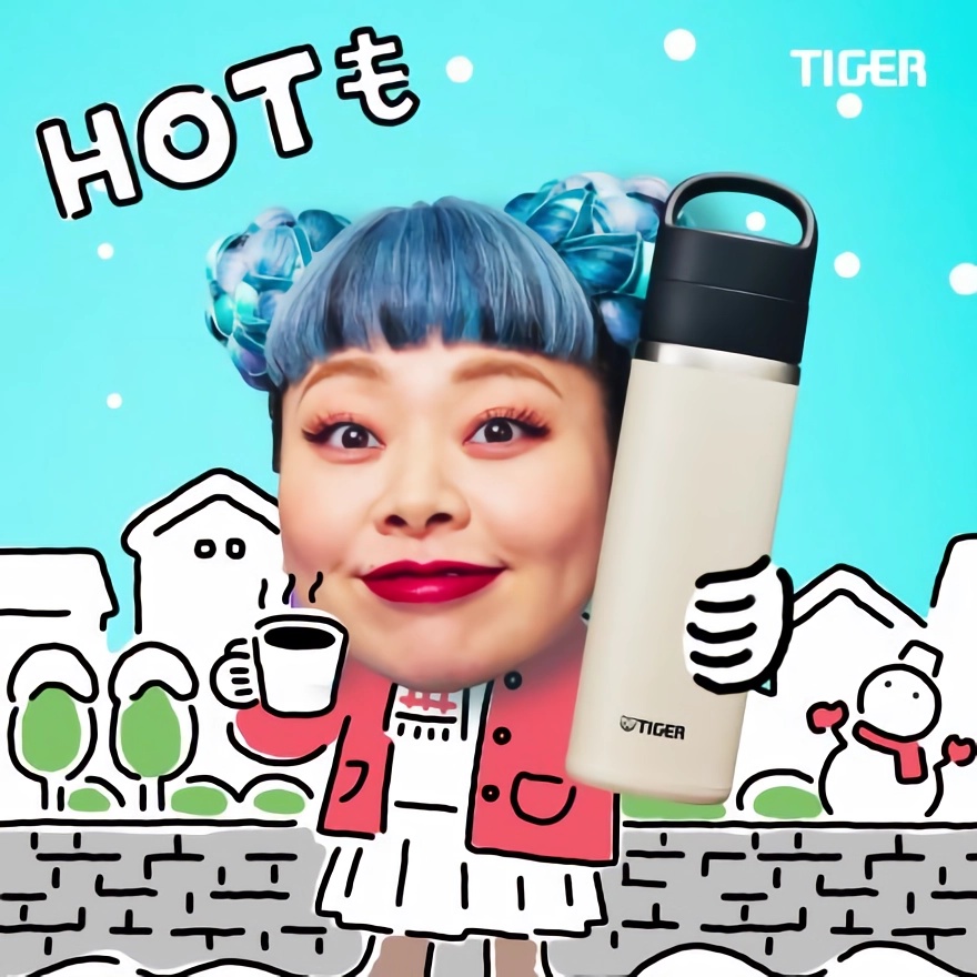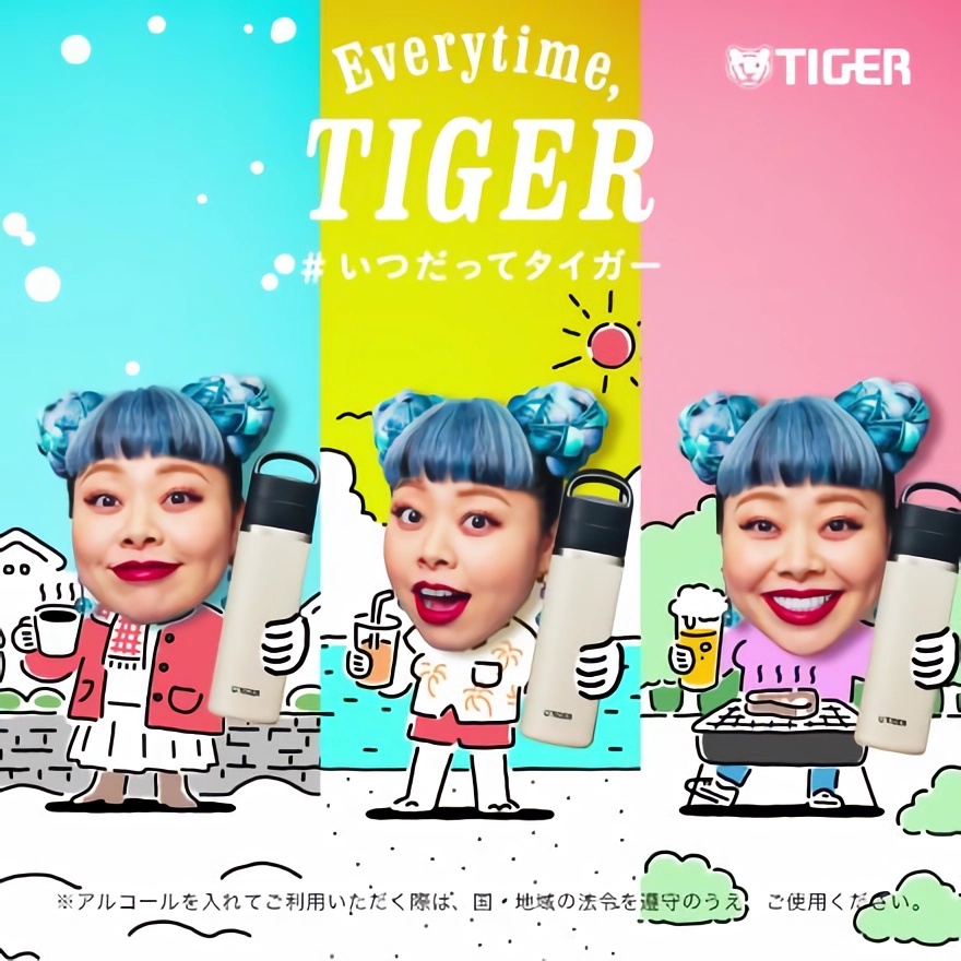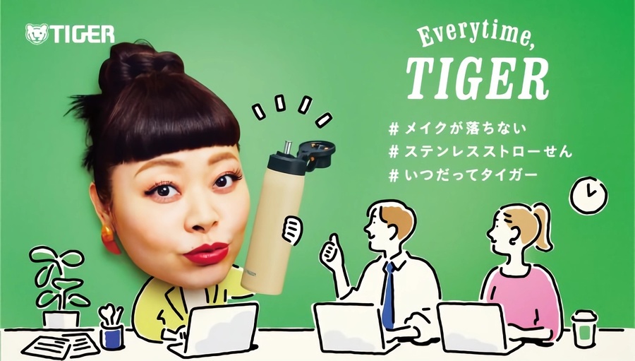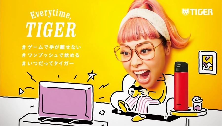 Следующая реклама от японского бренда Tiger выглядит не такой сумасшедшей, но все равно довольно необычной и интересной. Как можно проследит, здесь рекламируются термосы, которые благодаря вакуумной изоляции хорошо сохраняют температуру жидкости в ней. С лозунгом «Everytime, TIGER» веб-реклама пропагандирует, что их продукт подойдет к любому месту и любому времени. Постеры выполнены в поп-арт комиксном стиле и вставленной головой с фотографий Наоми. Так дешевым и эффектным способом наглядно показывается много ситуаций и локаций, где может использоваться термос от Tiger.