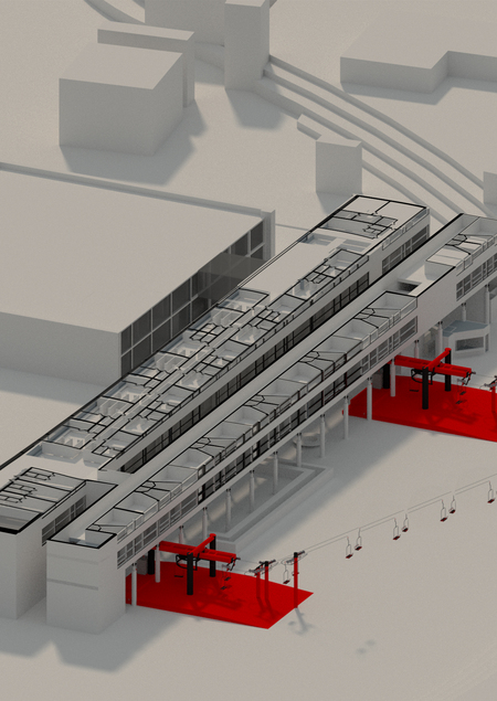 Данный проект гостиничного комплекса на 66 номеров включает в себя 2 встроенных подъемника на горнолыжный склон (находятся в зоне второго корпуса).