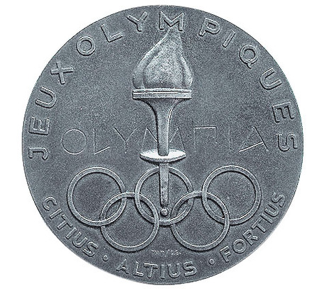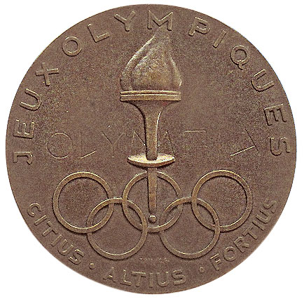 Аверс: в центре медали горящий факел, за которым стилизованным шрифтом написано название родины древних Олимпиад OLYМПIA, и олимпийские кольца. Вверху по окружности текст на французском языке: JEUX OLYMPIQUES (Олимпийские игры); внизу девиз на латыни: CITIUS · ALTIUS · FORTIUS (Быстрее — Выше — Сильнее).