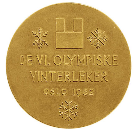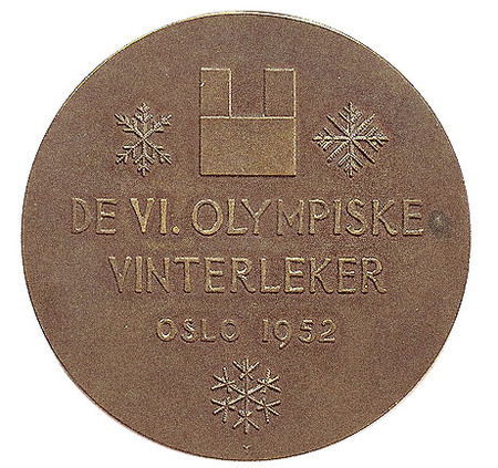 Реверс: вверху между двумя различными по форме снежинками пиктограмма городской ратуши Осло. Посередине в три строки текст на норвежском языке: DE VI. OLYMPISKE VINTERLEKER OSLO 1952 (VI Олимпийские зимние игры Осло 1952). Под текстом стилизованная снежинка. Внизу инициал фамилии норвежского художника: «Y».