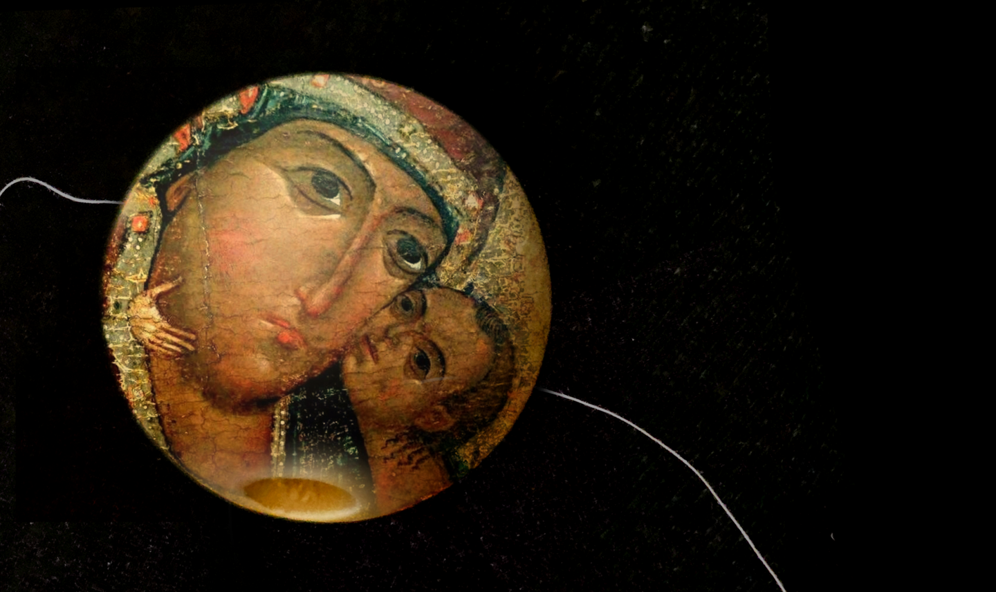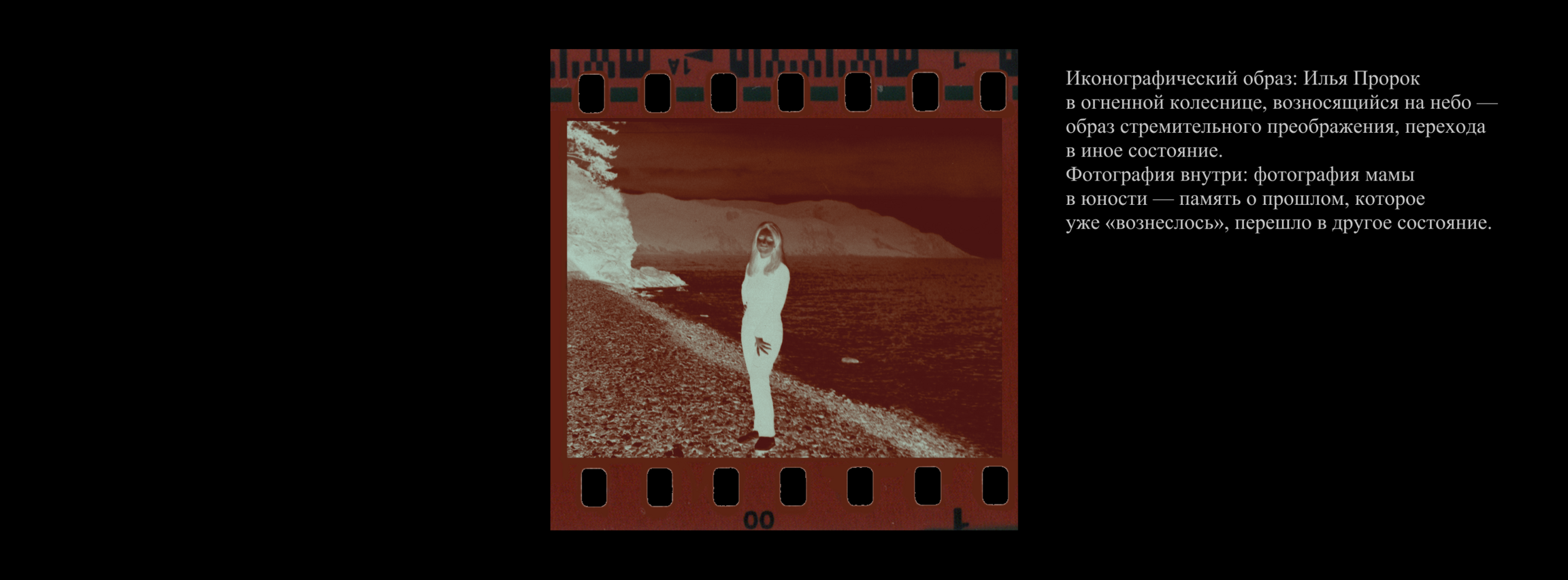 Каждая бусина — это двуслойный образ: Внешне — визуальный фрагмент, отсылающий к иконописи. Внутри — фрагмент личной истории: архивная пленка с фотографией, текстом или видео. Целиком ожерелье становится нарративом, собранной историей.