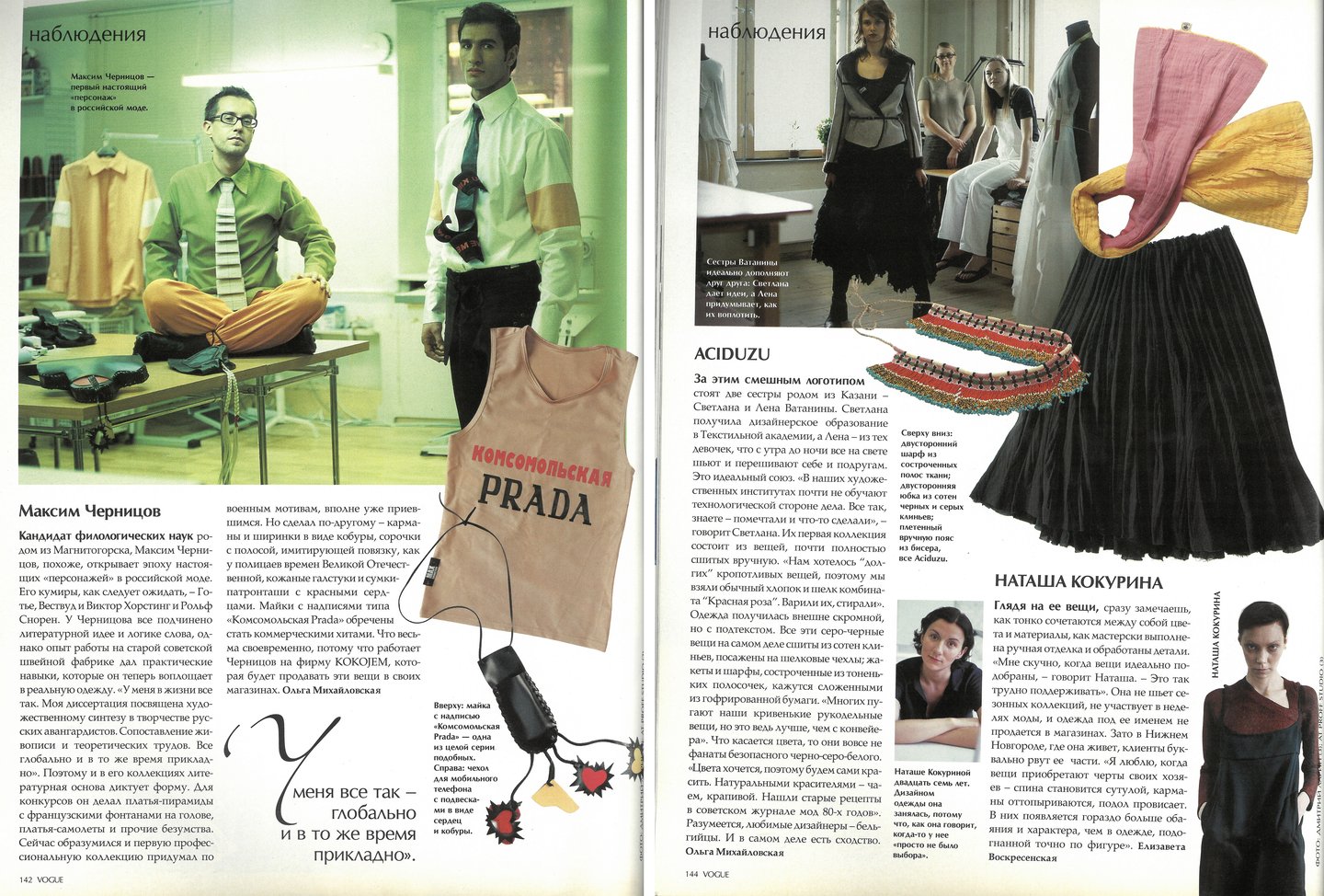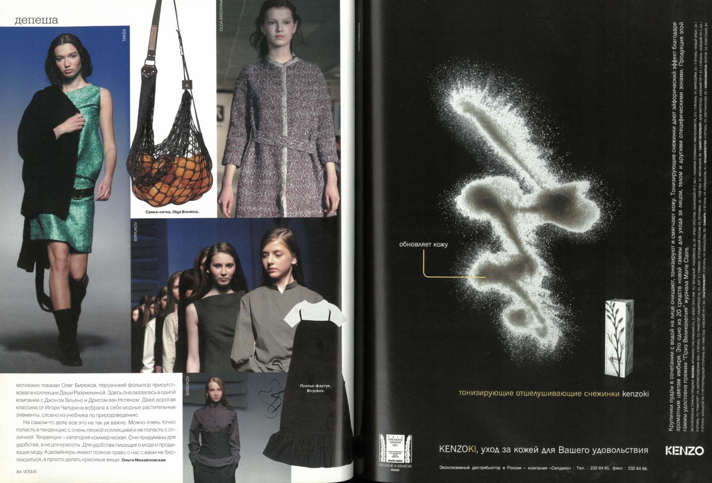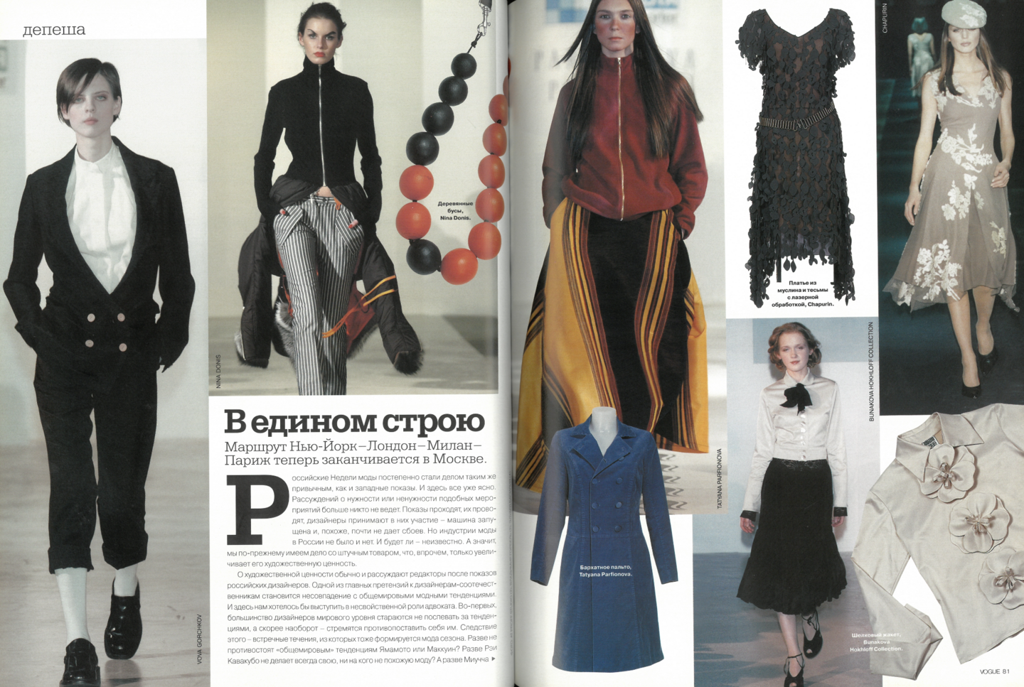Несмотря на специфику финансирования журнала, пролистав все номера Vogue до конца 2004 года, объем которых по сравнению с первыми номерами стал буквально в два-три раза толще и доходил до 450 страниц, половина из которых составляли рекламные материалы, мы можем с уверенностью сказать, что российские дизайнеры хотя в одном материале, но упоминались в каждом номере Vogue.