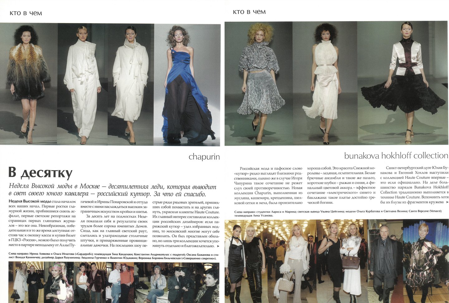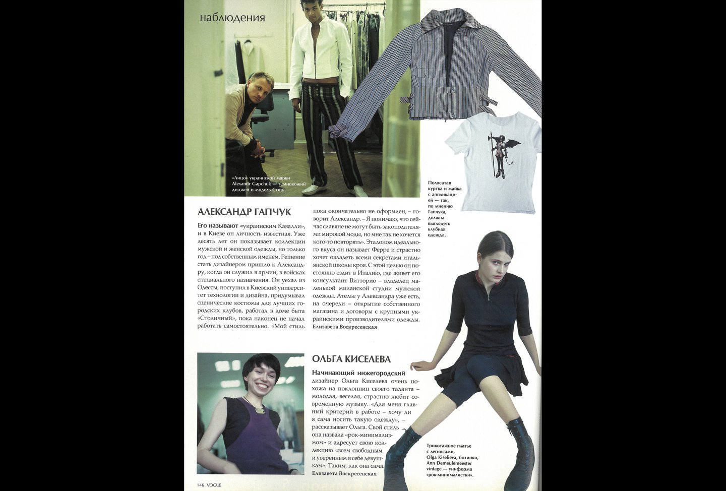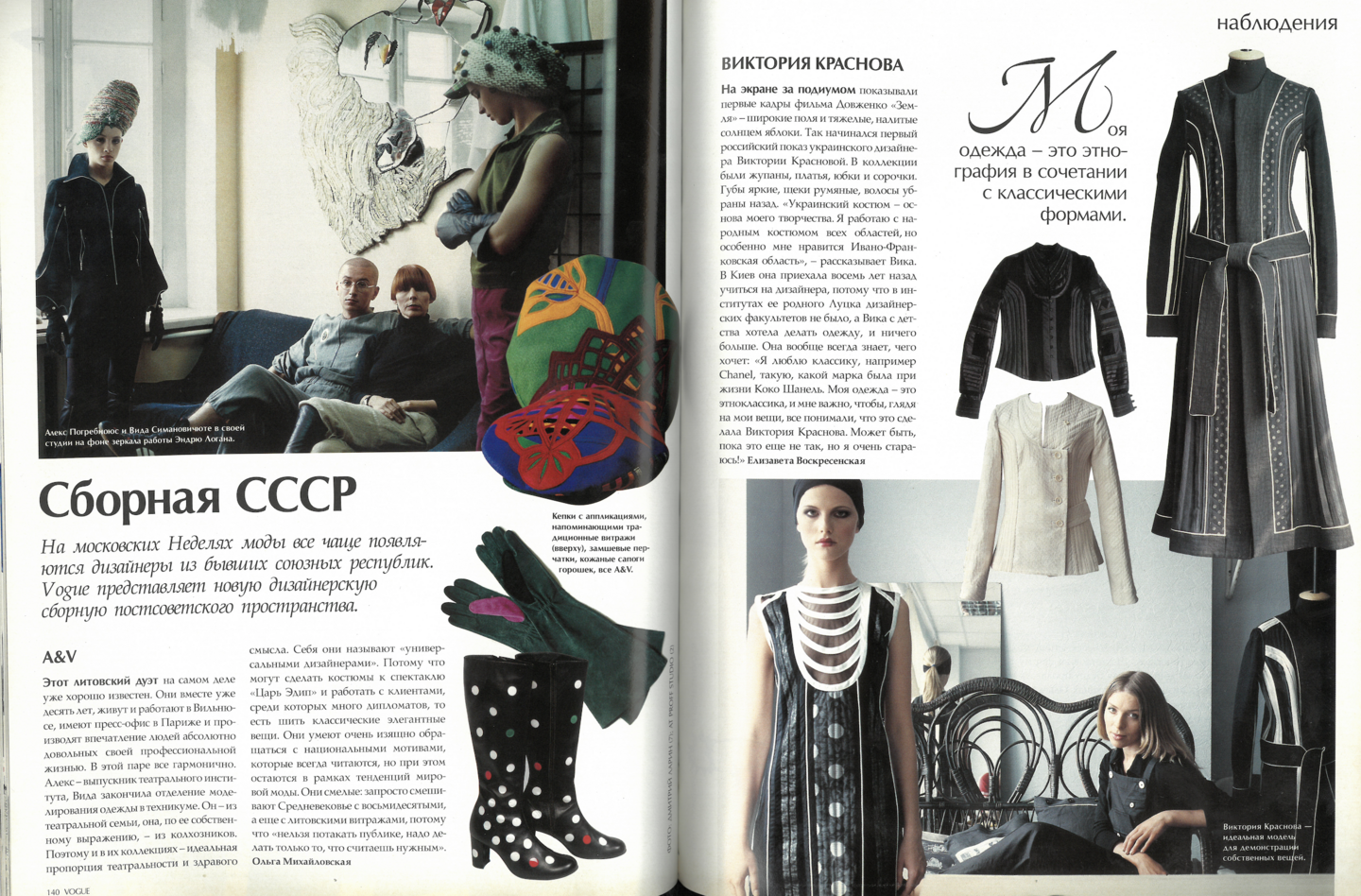 Несмотря на специфику финансирования журнала, пролистав все номера Vogue до конца 2004 года, объем которых по сравнению с первыми номерами стал буквально в два-три раза толще и доходил до 450 страниц, половина из которых составляли рекламные материалы, мы можем с уверенностью сказать, что российские дизайнеры хотя в одном материале, но упоминались в каждом номере Vogue.