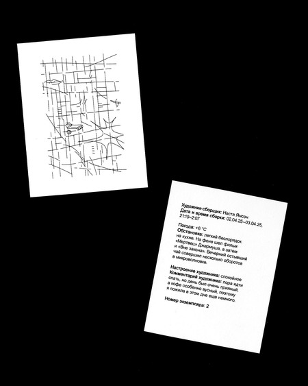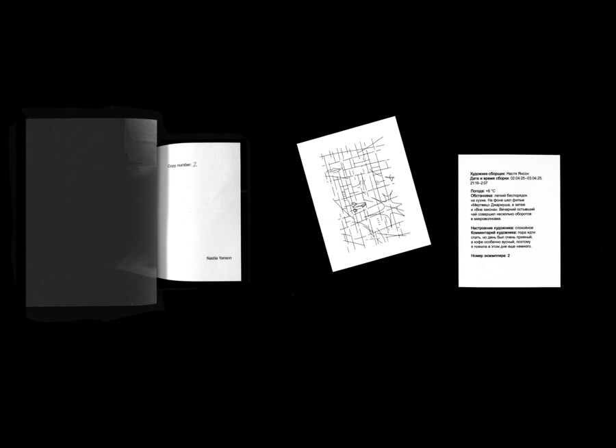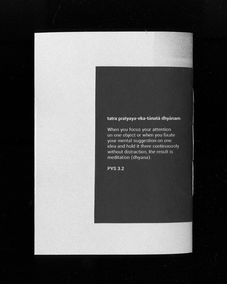 Тatra pratyaya-eka-tānatā dhyānam (PYS 3.2) — «Когда вы фокусируете внимание на одном объекте, удерживая его продолжительное время и непрерывно, — то результатом является медитация». Йога-сутра становится основой для зина, который сочетает в себе инструкцию по медитации (практики визуализации света) и художественную интерпретацию ощущений и мыслей, возникающих в процессе. Зин отражает путь через состояния медитативного опыта: от хаоса и запутанности мыслей до спокойствия и возвращения к реальности в новом состоянии.