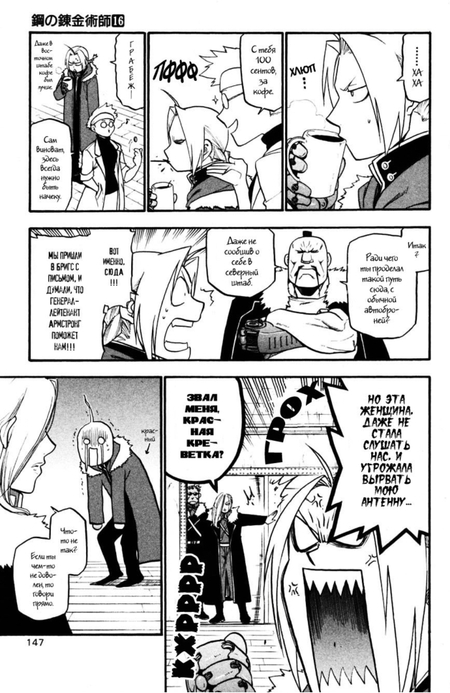 Но за счет комедийного жанра все же встречаются деформации анатомии, в особенности лица (что уже в большей степени относится к символико-знаковой системе манги [5, 8]), визуального подчеркивания комичности отдельных сцен (как в уже упоминавшемся сёнэне Хирому Аракава «Стальной алхимик»).