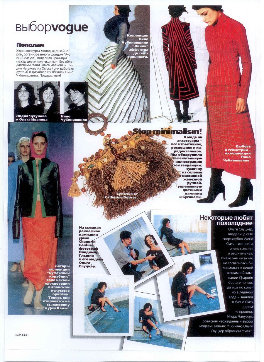 Лида: Мы с Олей Ивановой из института, она была на год старше. У нас сложился тандем: вместе учились, вместе потом в Москву. Стажировка длилась дней десять, может, две недели. Нас отправили в отдел аксессуаров: «Рисуйте, что хотите». Как таковой стажировки, где мы что-то создавали, а они брали в коллекцию, не было. Но это ничуть не помешало другому: мы прошли по всем цехам, увидели процессы. Я поняла, что, кроме громких имен вроде Маккуина, есть дизайнеры линейки, о которых публика не знает. Впитала отношение к работе, безграничные возможности по технологии и конструированию — этого было более, чем достаточно.