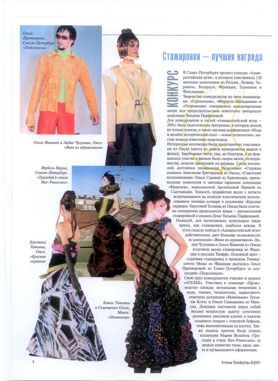 Были и другие награды: в Перми — «бриллиантовая игла с платиной». Это был один из первых фестивалей «Прикамская осень» [Прим. АРМ: Фестиваль моды «Прикамская осень» проходил в Перми, начиная с 1995 года. К концу 1990-х годов (примерно в 2000 году) фестиваль был переименован в «Бриллиантовую булавку» и проходил до 2008 года]. Приз — игла, усыпанная бриллиантами и платиной. Нам назвали цену — мы охренели. Приз забрали, он до сих пор хранится у Оли.