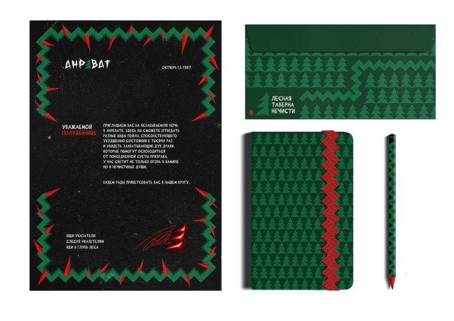 Проект представляет собой брендинг для «Анревата» — противоположности таверны. Постояльцы этого места вовсе не люди, а представители самой разной нечистой силы. Если обычные таверны находятся в городах или близ них, Анреват располагается в непроходимой чаще леса, куда обычному человеку попасть будет крайне сложно. Проект строится на трех составляющих: нечисть, выпивка и лес.