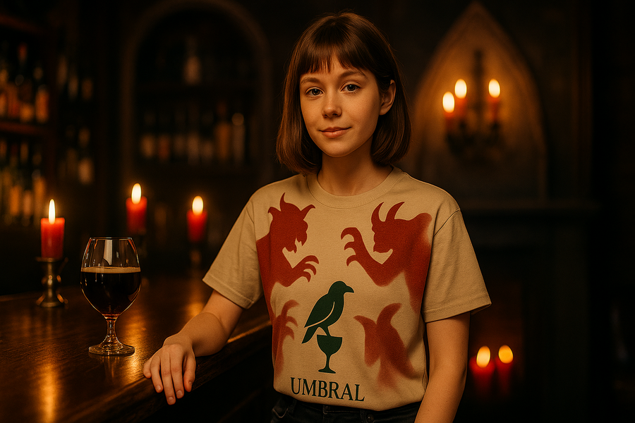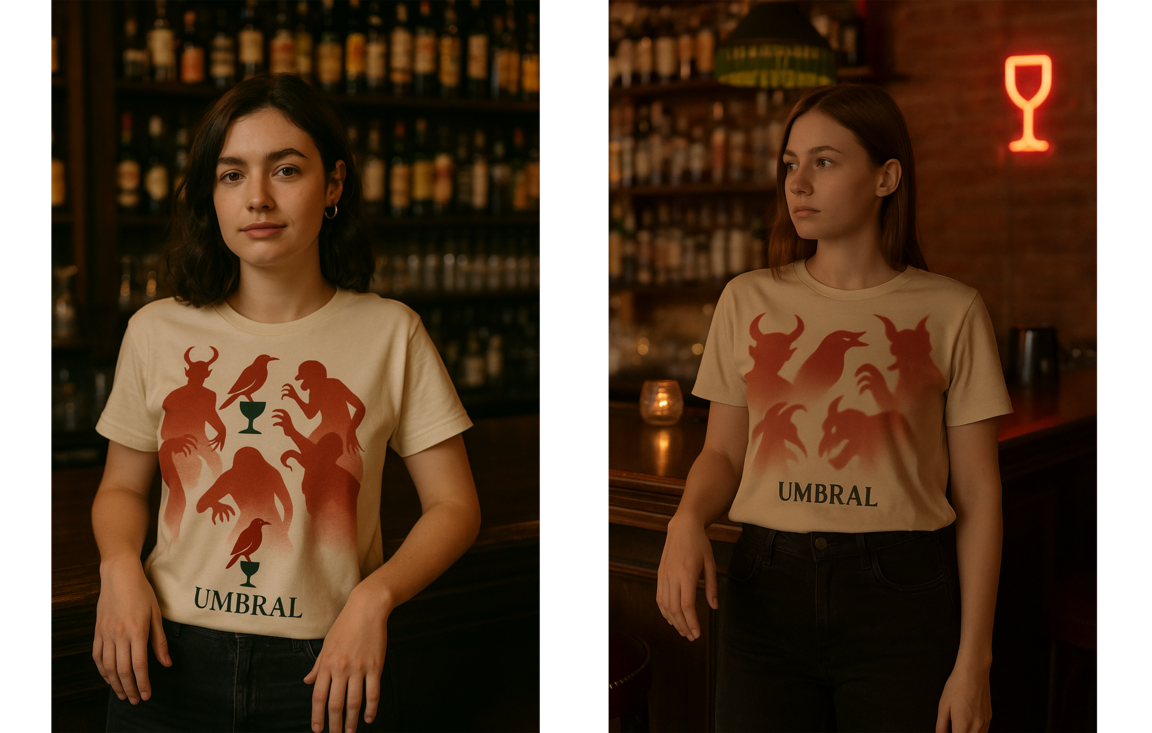 prompt: Format: horizontal 3:4 Style: vintage + modern mysticism Lighting: soft, smoky, with amber accents An atmospheric bar in dim light, with a dark wooden bar and brass elements. On the shelves behind, there are bottles with beige labels and shadows of evil spirits on the walls. The warm, soft amber light comes from the bottles and the lighting under the bar. Behind the counter, there are waiters in light «role-playing» images of evil spirits (with a hint, not directly). On the tables, there are candles, glasses, and soft green and burgundy accents. On one of the walls, there is the UMBRAL logo (a raven on a glass) made of bronze or engraved with light. There is a slight haze in the air, golden dust particles, and flickering lights. The atmosphere is cozy, mysterious, and feels like a place «between worlds.»