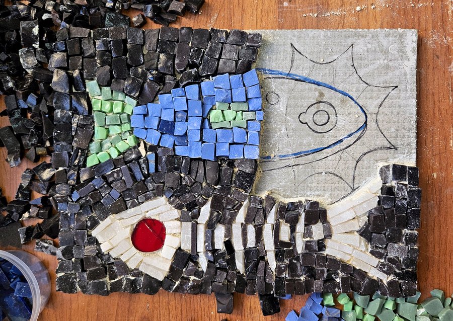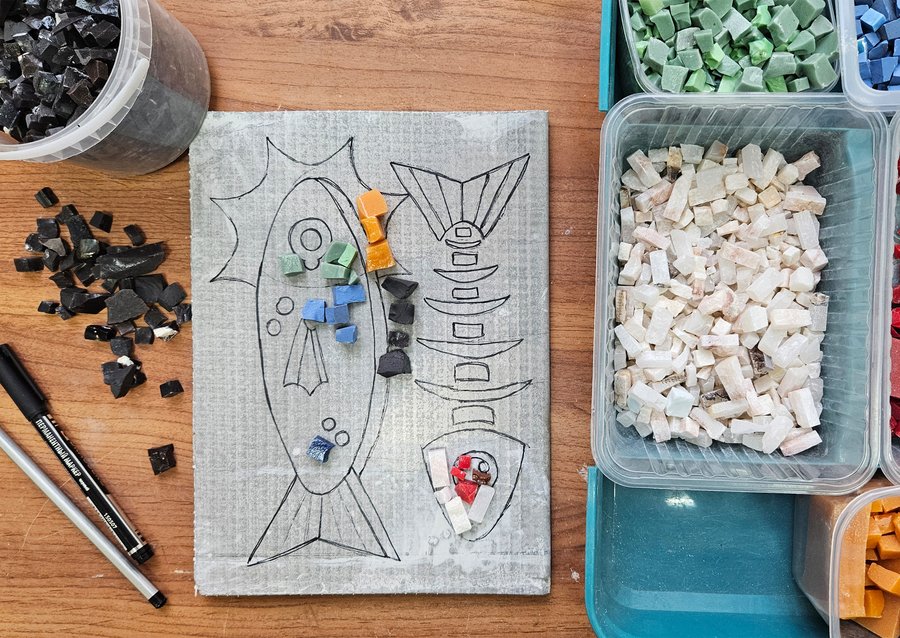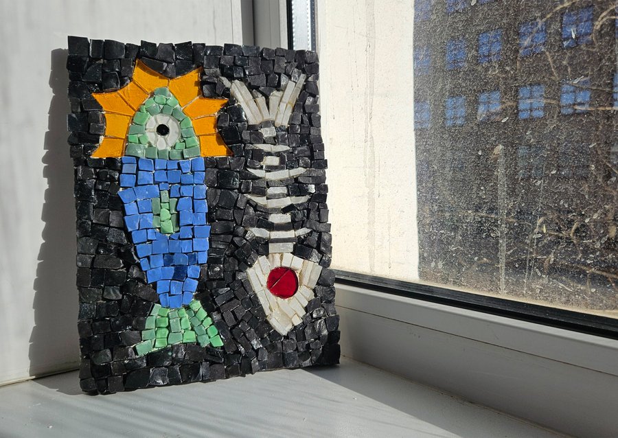 Мозаика, вдохновленная морскими существами и их символизмом. Слева — живая рыба, которой суждено попасть в сети, справа — её скелет с каменным глазом, смотрящим в пустоту.