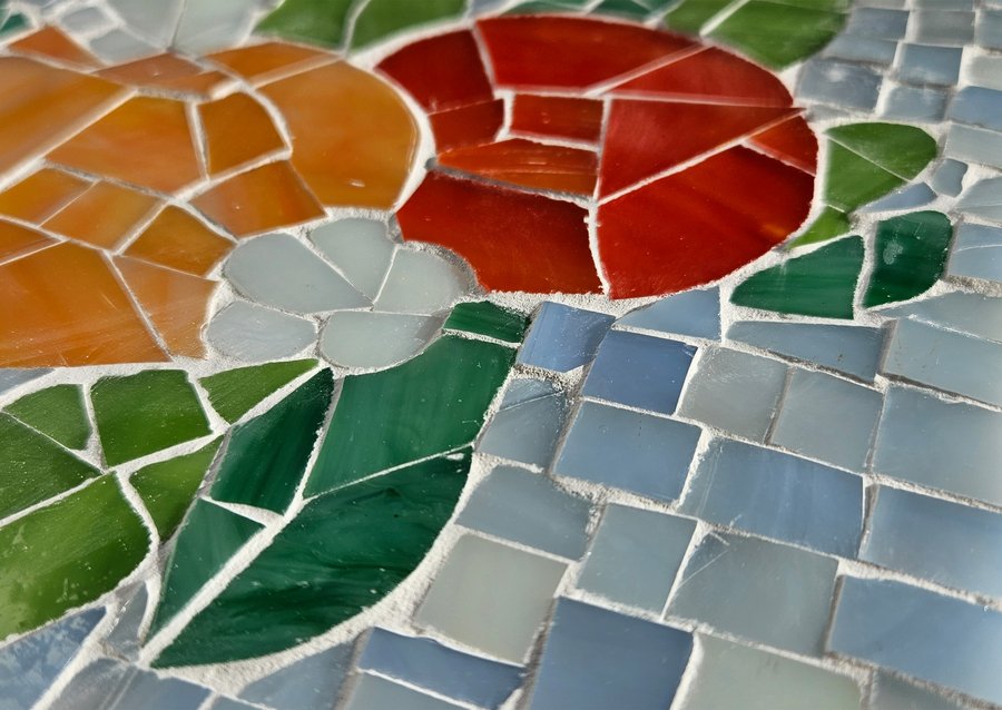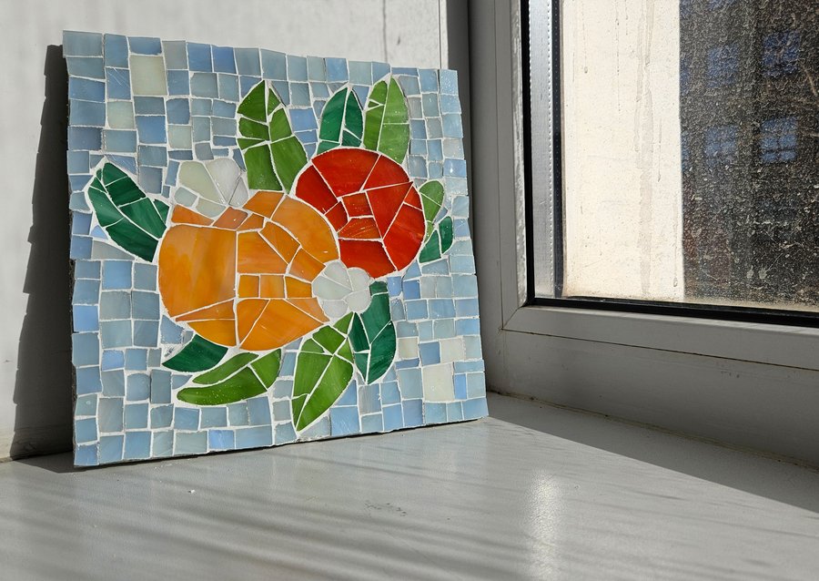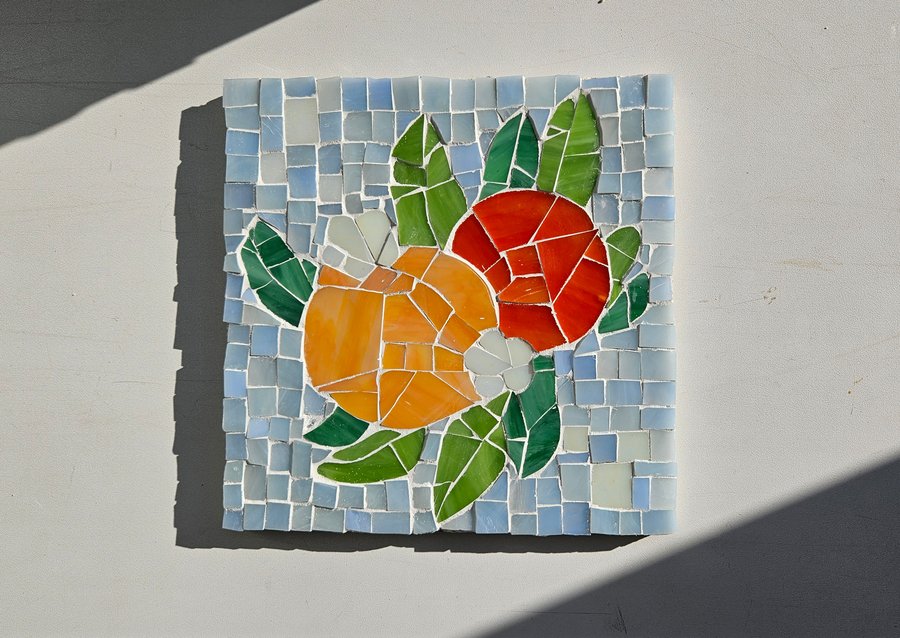 В качестве последней мозаики, когда на улице уже начало становится тепло, мне захотелось создать что-то, что напоминало бы мне о море и солнце. На ум приходил сладкий вкус ярких апельсинов.