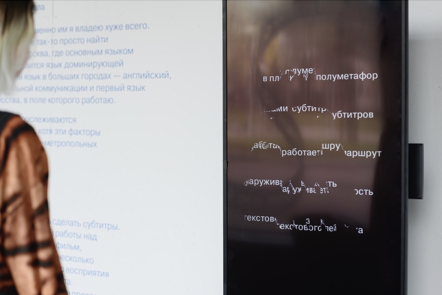 Инсталляция «Сквозь слово» находится между двумя частями кураторского текста. Когда зритель оказывается в зоне видимости камеры, сложенные строчки слов разлетаются, препятствуя чтению и дублируя силуэт посетителя. Однако замерев, текст успокаивается и возвращается в считываемую форму.