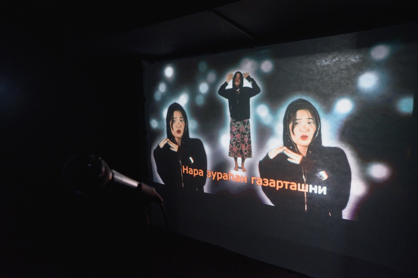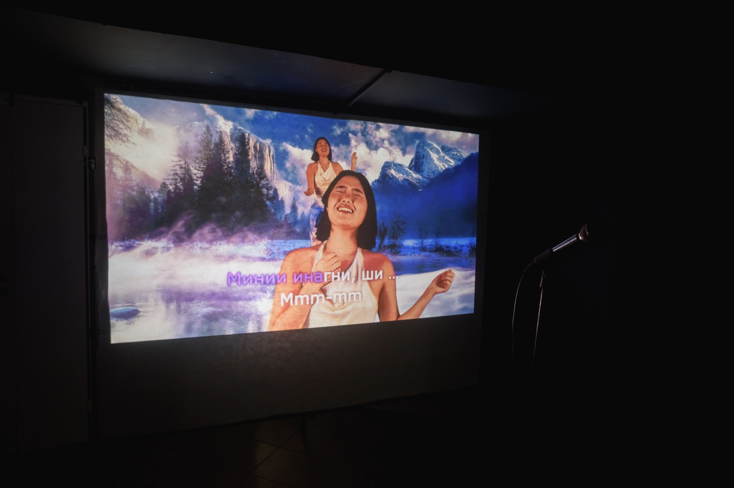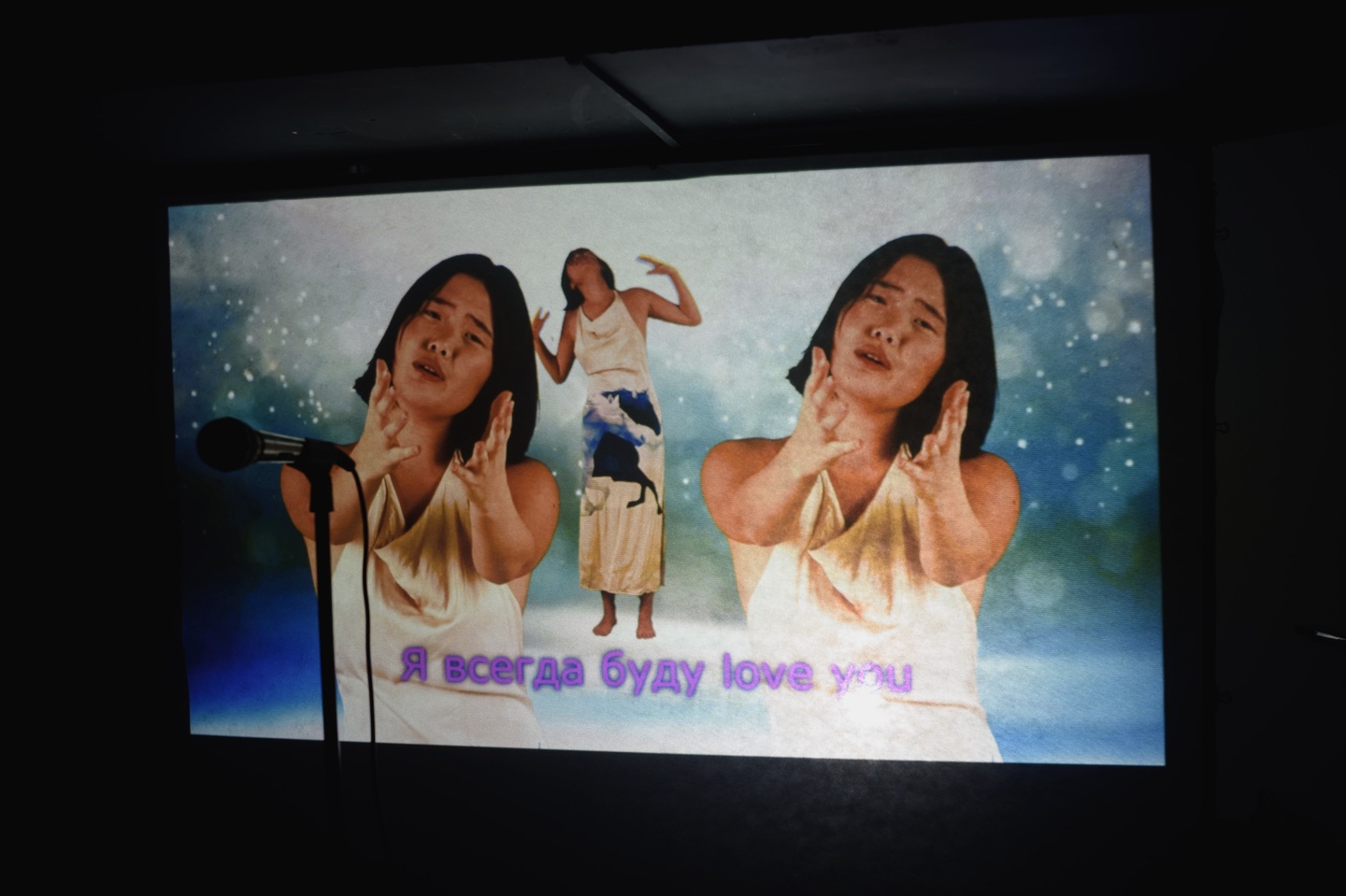 «Караоке о любви» предлагает зрителю спеть три песни на трех языках: бурятскую «Түрүүшын дуран», русскую «Позови меня с собой» и английскую «I Will Always Love You». Это песни о любви, исполненные женщинами примерно в один временной промежуток. Первая — народная песня, мелодия любого бурятского застолья, написанная Цыреном Шойжонимаевым в 1989 году. Вторая — одна из самых известных песен легенды советской и российской эстрады Аллы Пугачевой на стихи Татьяны Снежиной. Третья — песня Долли Партон, которая известна прежде всего в исполнении Уитни Хьюстон для фильма «Телохранитель». Все три композиции вшиты в культуру: бурятскую (Түрүүшын дуран), русскоязычную (Позови меня с собой), и мировую (I Will Always Love You). Но в сознании культуры не делятся по категориям, а варятся в едином котле с мемами, детскими воспоминаниями и нон-фикшн литературой. Достав из этого котла знакомую многим форму караоке-слайдшоу, художница перемешивает языки, делая каждую песню трехъязычной, размывая иерархии и смешивая культурные коды.