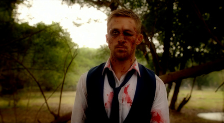 Синяя палитра пронизывает сцены, связанные с криминальным миром, например, начальную сцену погони по темным, залитым неоном улицам Лос-Анджелеса, когда Водитель выполняет роль перевозчика во время ограбления. Даже начальник Водителя, Шэннон, всегда окружен синим цветом, что подчеркивает его связь с преступной средой, хоть и периферийную.