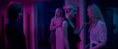 Розовые и фиолетовые цвета в фильме задают ассоциацию как с сексуализированной женственностью и гламуром, так и с завистью и искуственностью. Эти насыщенные, неестественные оттенки заполняют сцены в клубе, где мы понимаем, что женское тело в мире моды Рефна предельно эстетизировано и превращено в объект сексуального и визуального потребления. Можно сказать, что пурпурные, розовые и фиолетовые оттенки образуют переходное звено между синим (смерть, одиночество) и красным (насилие, страсть, злоба).