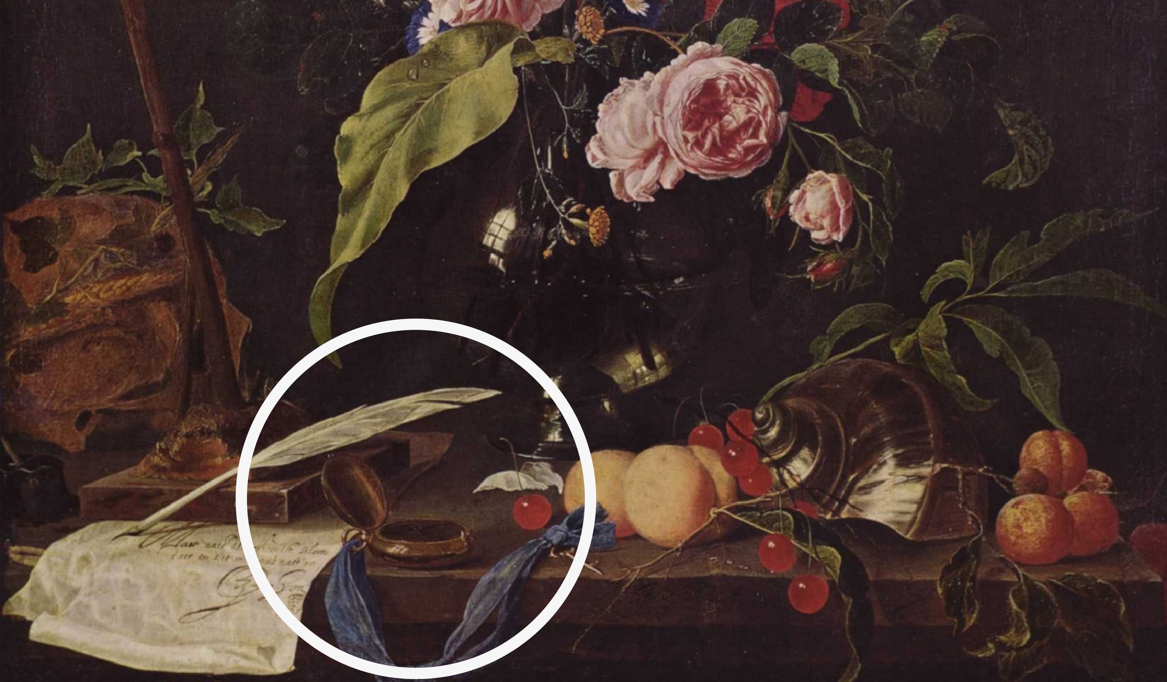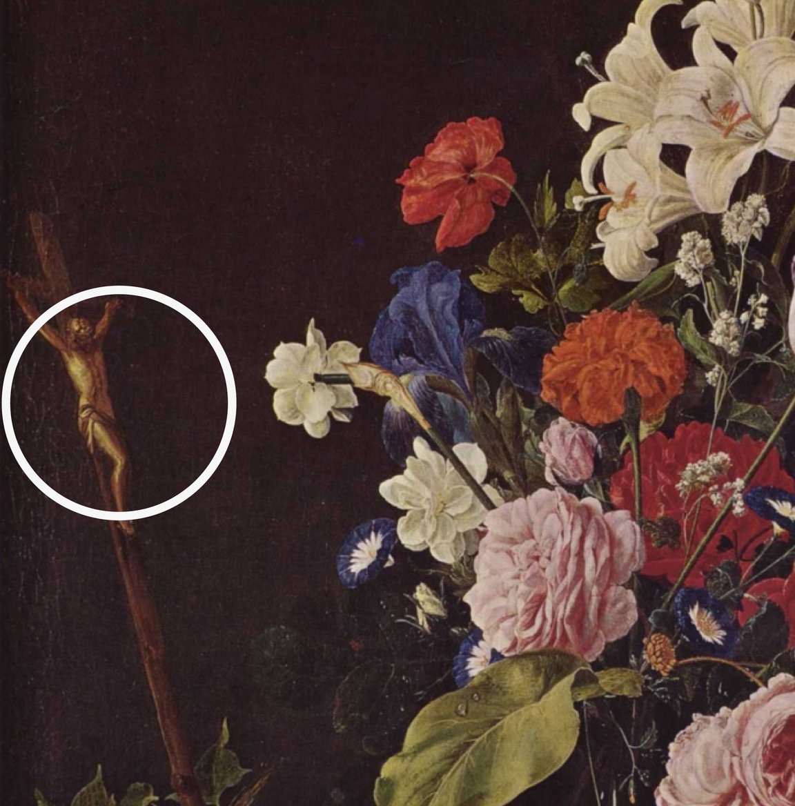 Изображение цветов в религиозных сюжетах позволяло навеки запечатлеть красоту мудрости и щедрости самого Творца, напоминая и о бренности земной жизни. Эта христианская идея отражена в картине Яна Давидса де Хема (1606−1683) «Натюрморт с распятием и черепом» (Мюнхен, Старая Пинакотека). О скоротечности жизни в цветочном memento mori, как правило, напоминает изображение часов или черепа. В натюрморте же с другим набором предметов в этой роли выступает сам цветок.