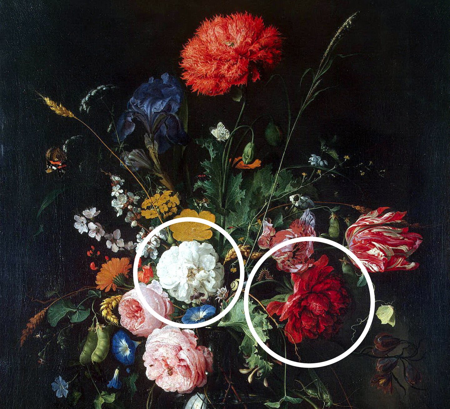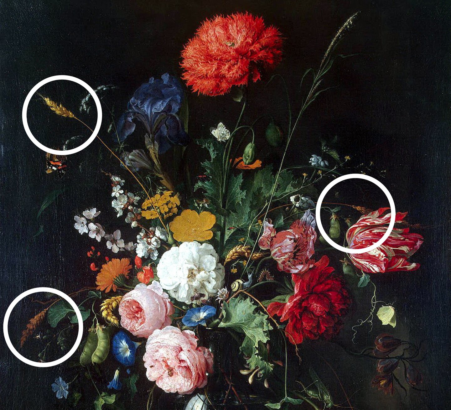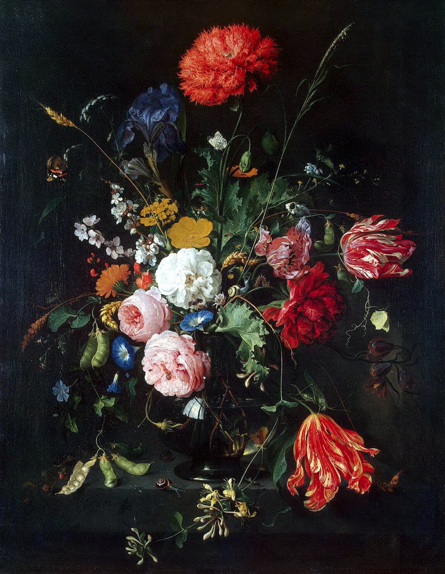 Включенный в букет хлебный колос символизирует не только хлеб Причастия, но и Воскресение, поскольку человек, подобно зерну, возрождается к новой жизни после погребения в землю. В композиции другой картины Яна Давидса де Хема -«Букет цветов в стеклянной вазе», — очевидно доминирование алого мака и белой гвоздики. Зрителям мак напоминал о скоротечности живой красоты, а скрытые в нем темные семена — о смерти и забвении. Белая гвоздика символизировала чистую и ясную христианскую жизнь.