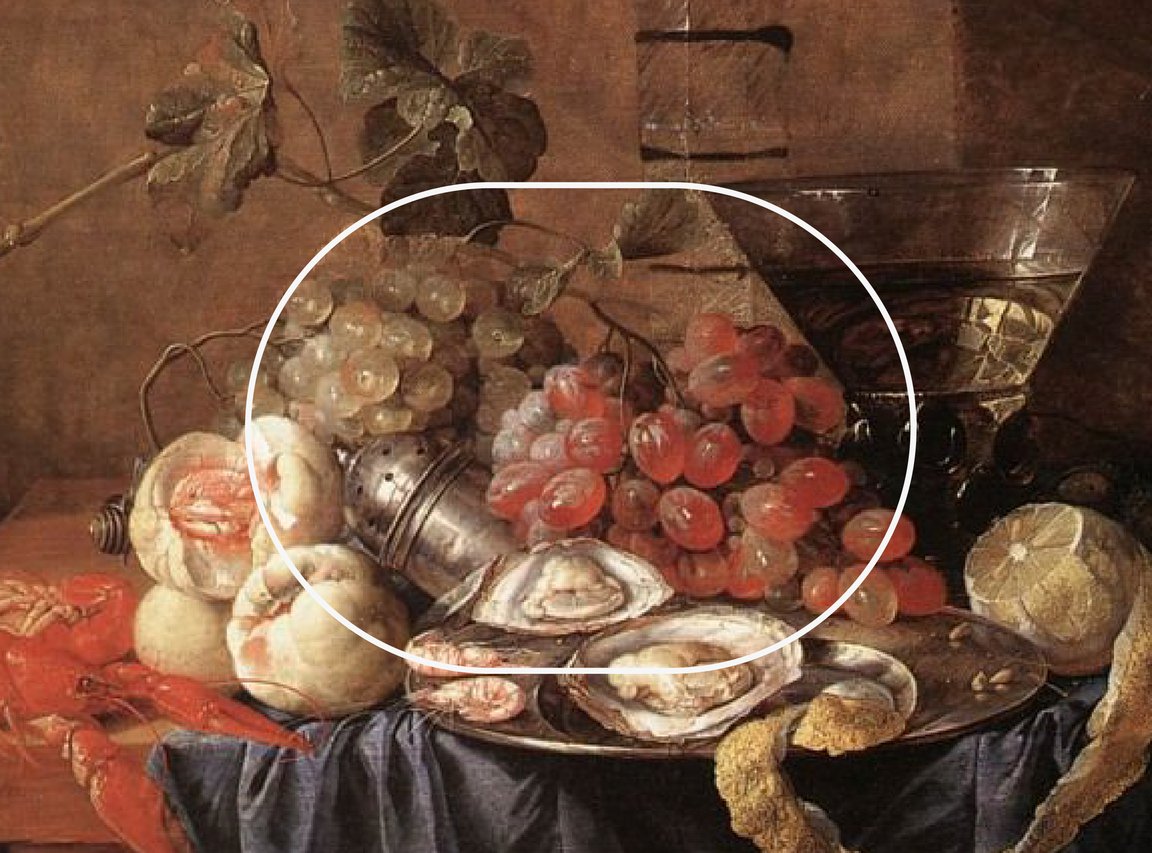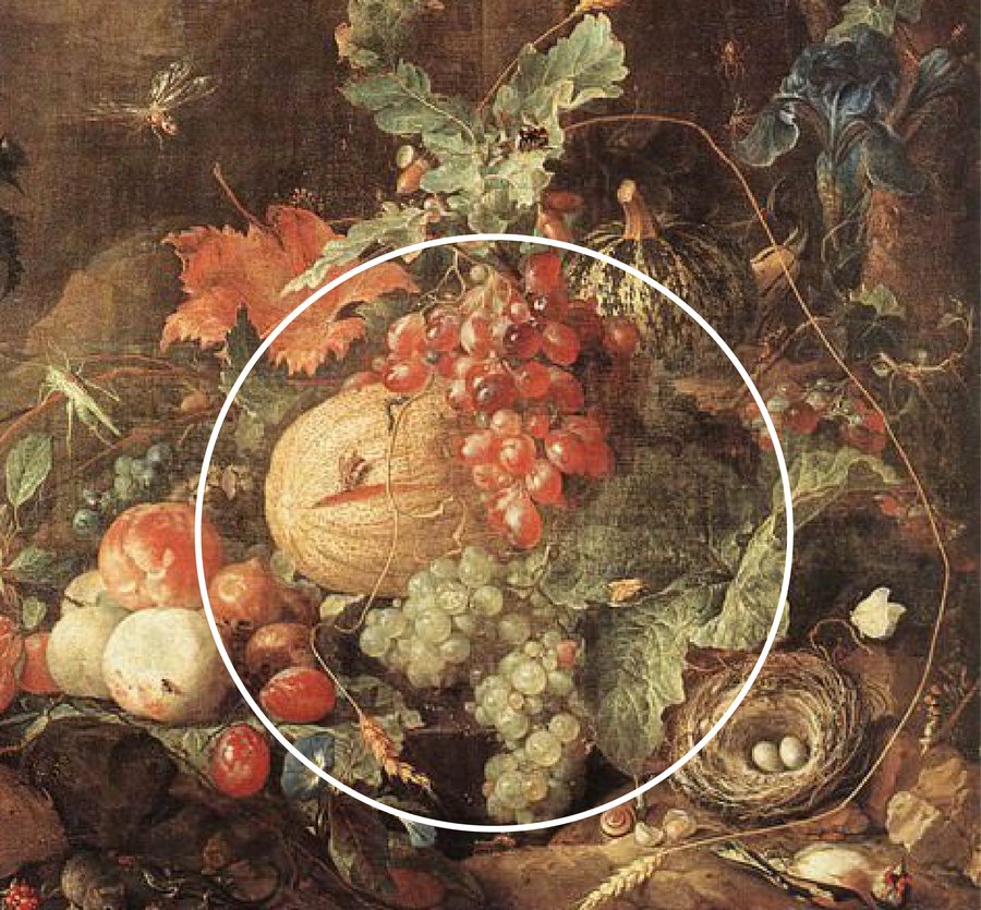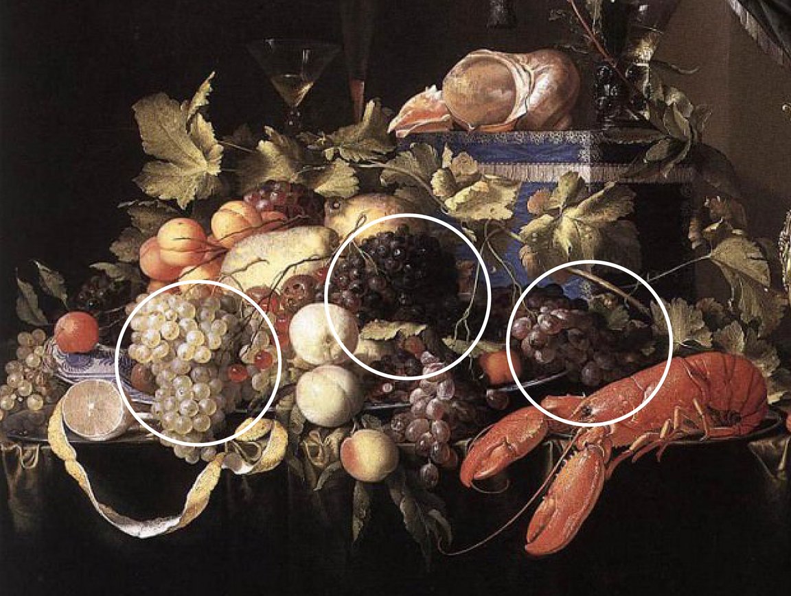 Фрукты в натюрмортах голландского золотого века — не просто элементы декора, а мощные символы, несущие глубокий смысл. В работах де Хема они используются для передачи идей изобилия, бренности, красоты и моральных напоминаний. Например, виноград предстает как символ изобилия, плодородия и радости. Также ассоциируется с христианской символикой: вино как символ крови Христовой. В натюрмортах де Хема виноград часто изображается в изобилии, подчёркивая богатство и роскошь.