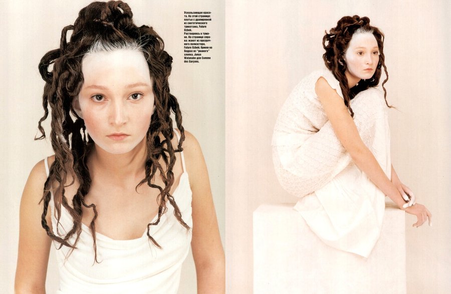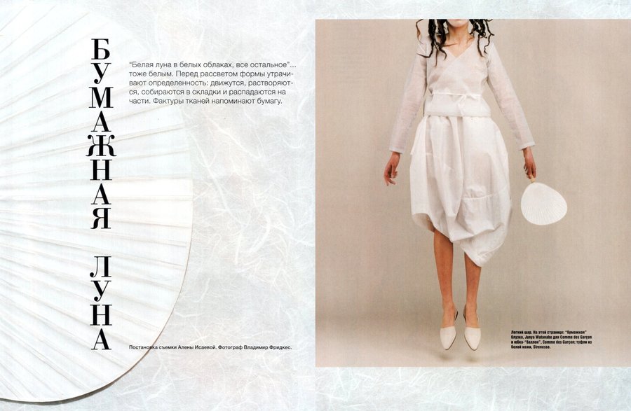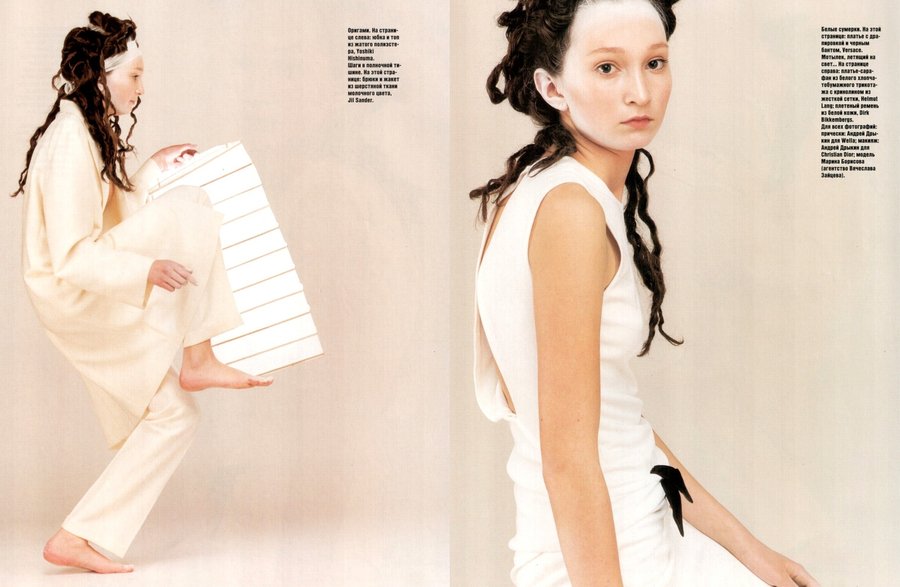 Алена: Или я помню съемку «Рисовая бумага» 1998 года. На показе Chanel стены были затянуты белым флизелином. У нас, конечно, ничего похожего невозможно было тогда найти, поэтому я решила везти этот флизелин из Франции. На следующий день вернулась на площадку, где проходил показ, чтобы спросить, где достать такую ткань, и поехала за ней на фабрику под Парижем.