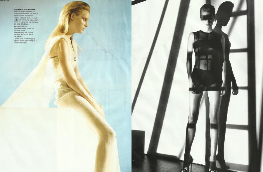 «На просвет», Harper’s Bazaar Russia май/июнь 1997 / Фотограф: Steven Klein, стилист: Sarajane Hoare, визажист: Diane Kendal for Aveda, модели: Amy Wesson & Kylie Bax